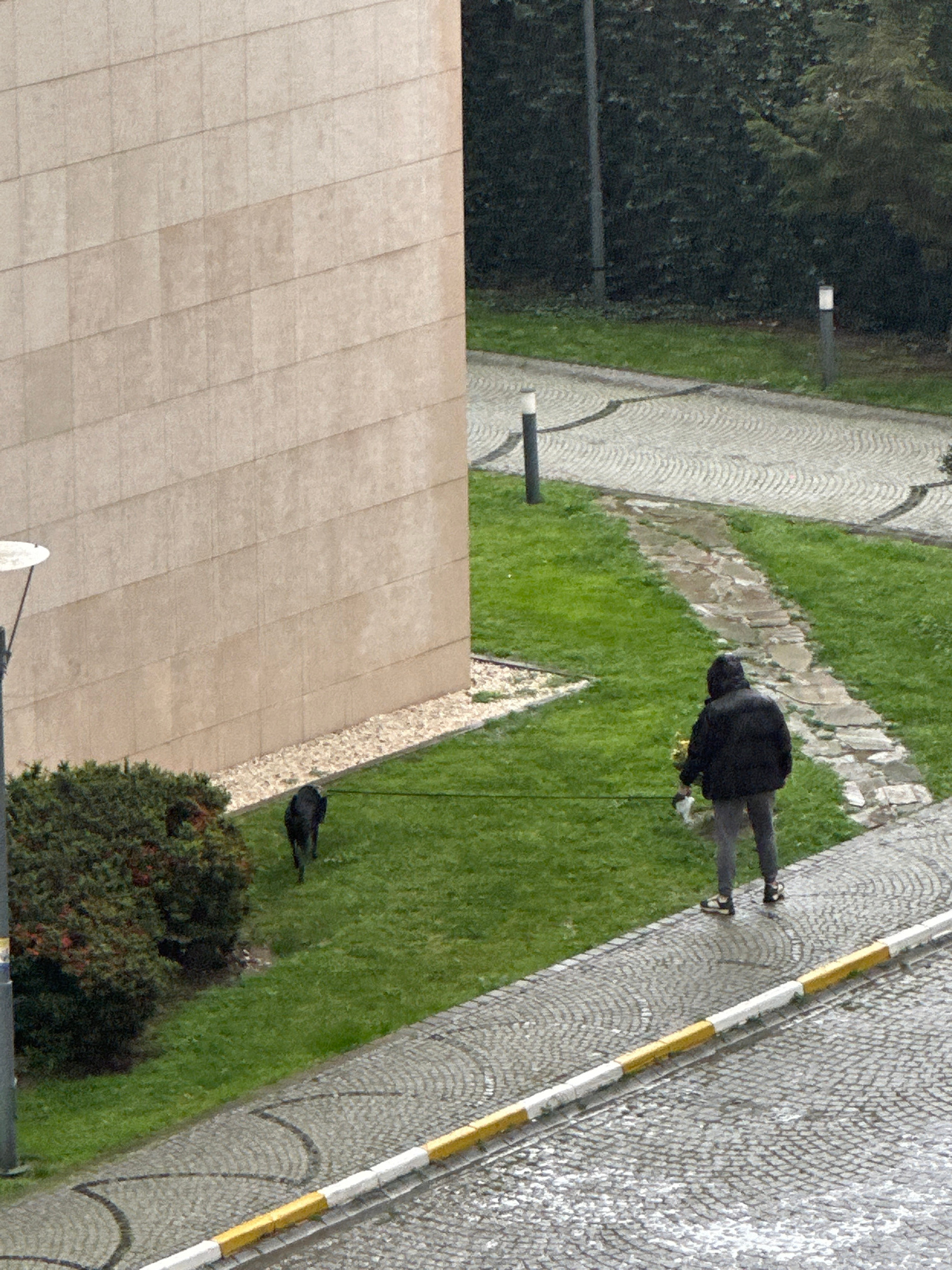 An aerial shot shows a person walking on a cobblestone walkway alongside a grassy area, near what appears to be a building. The person wears a dark jacket and light gray pants. A crow stands on the grass near a bush. The location is likely in Esenyurt, Turkey, given the prompt. The walkway is edged with a yellow and white curb. There are several lighting posts. | Open Wire