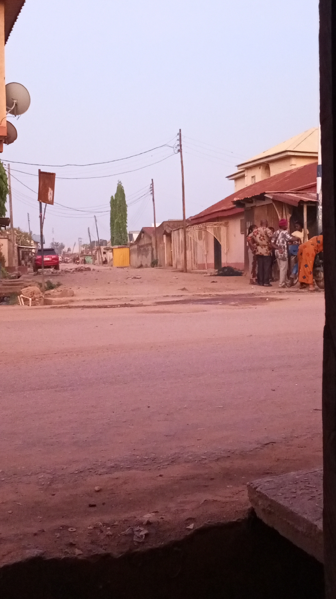 The image depicts a street scene in Sabon Tasha, Nigeria. The street is unpaved and dusty, with buildings lining either side. A group of people are gathered in front of one of the buildings. A red car…read more