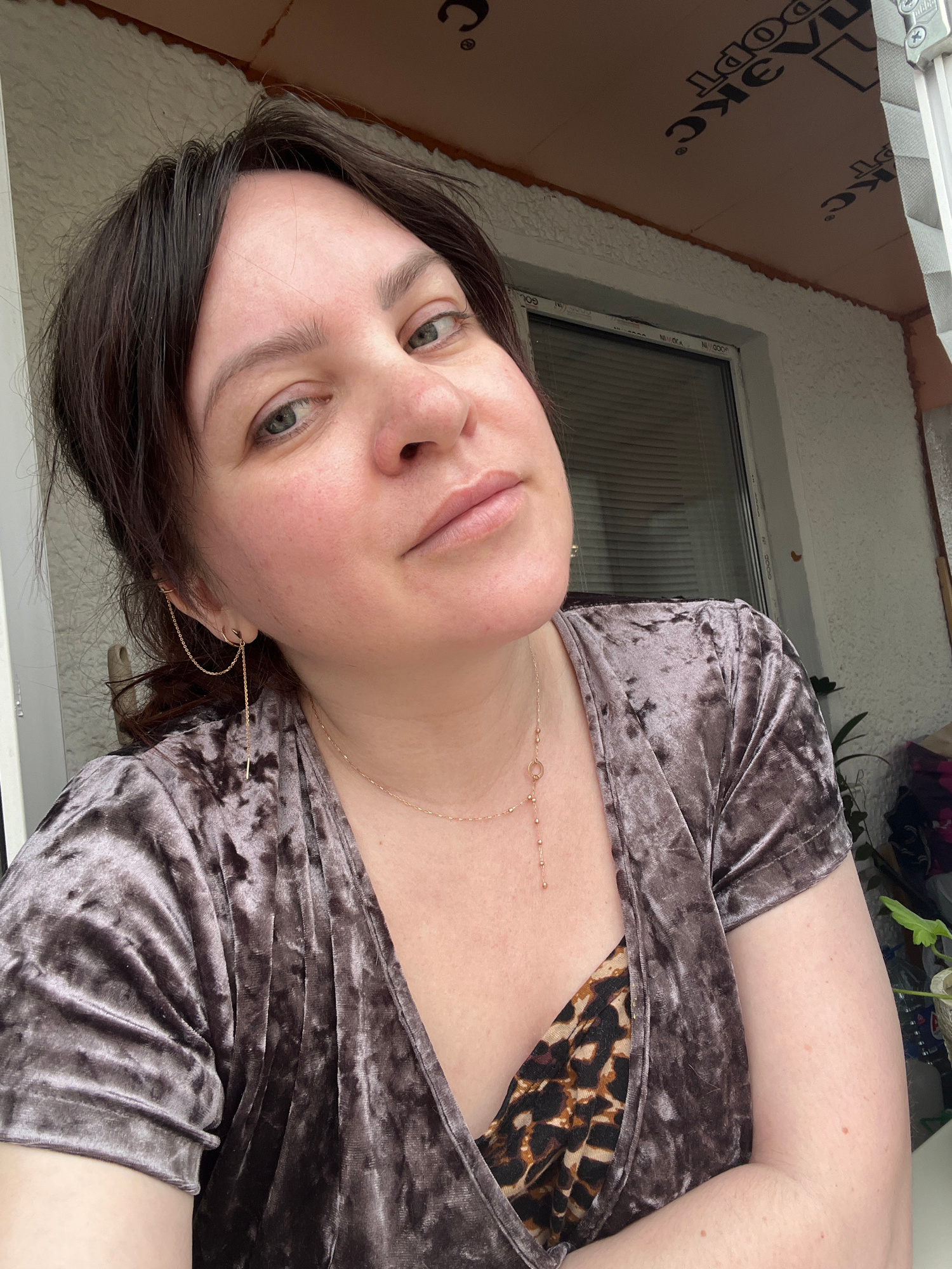 A selfie shows a woman with light skin, green eyes, and dark brown hair, wearing a gray velvet top with a leopard print underlay, and gold jewelry (necklace and earrings). The background includes a wi…read more
