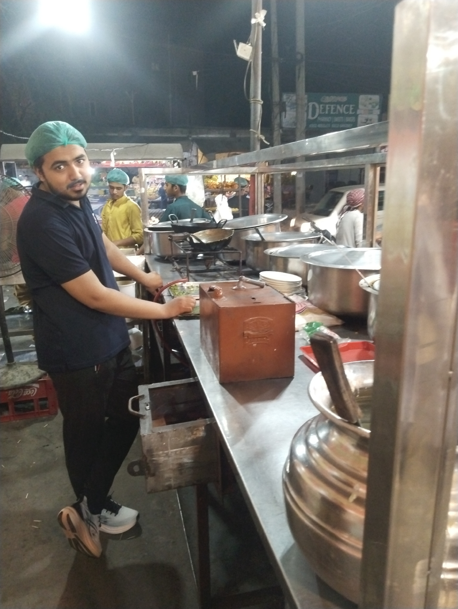 The image captures a nighttime scene at an outdoor or semi-outdoor food stall or small eatery, likely in Heir, Pakistan. The primary subject is a young man in the foreground, wearing a dark blue polo…read more