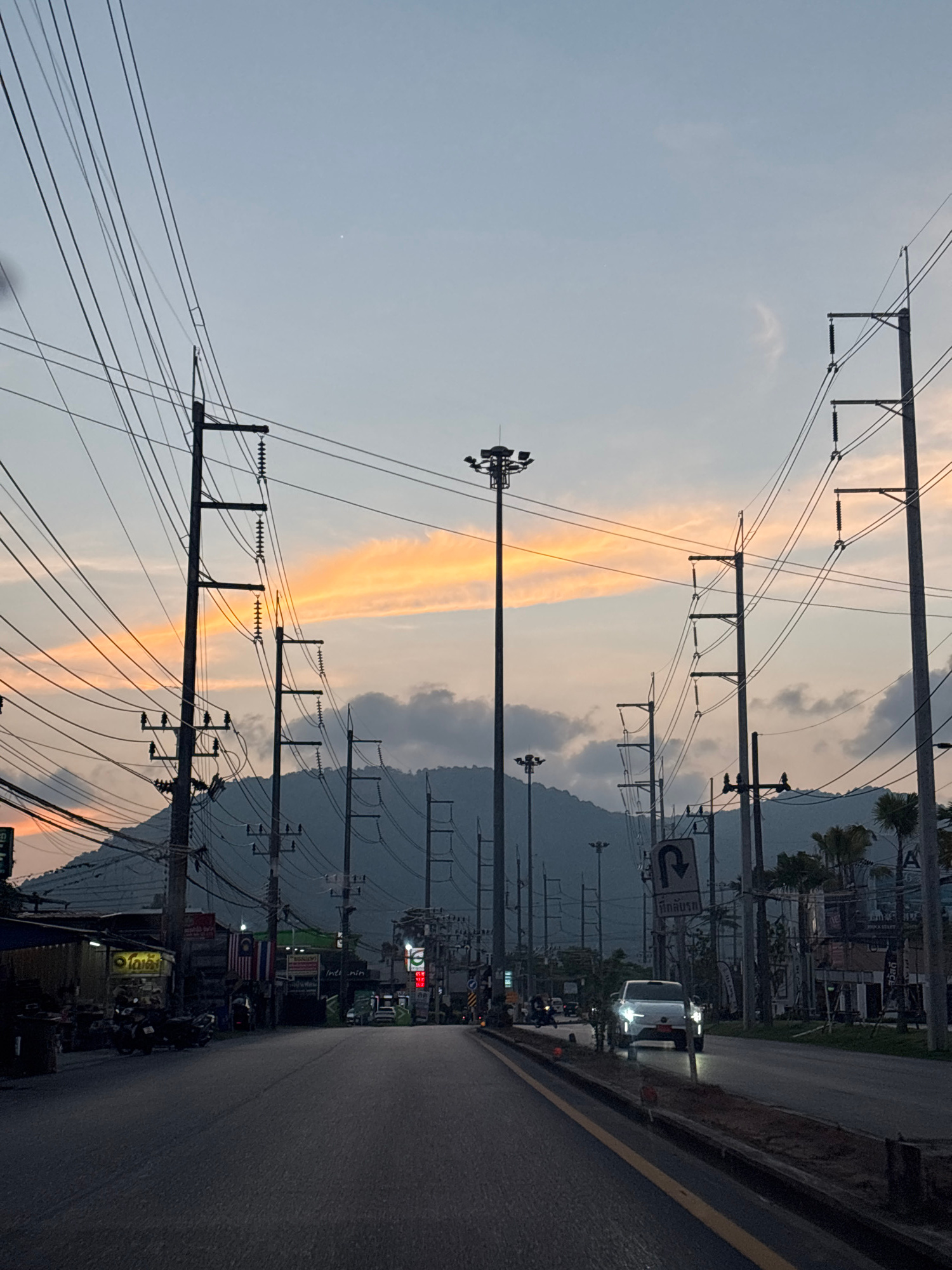 Captured from an eye-level perspective, the photograph depicts a street in Kathu, Thailand, lined with utility poles and power lines that crisscross the sky. The sun sets in the backdrop, casting an o…read more