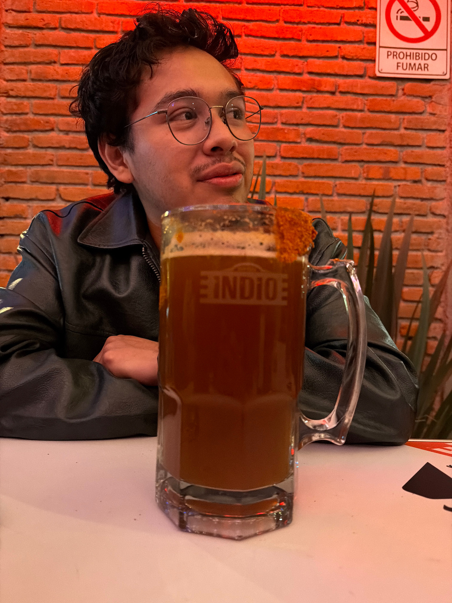 A young man wearing glasses and a black leather jacket is seated at a table with a large mug of Indio brand beer. The beer mug has a chili-salt rim. The background shows a red brick wall and a "Prohib…read more