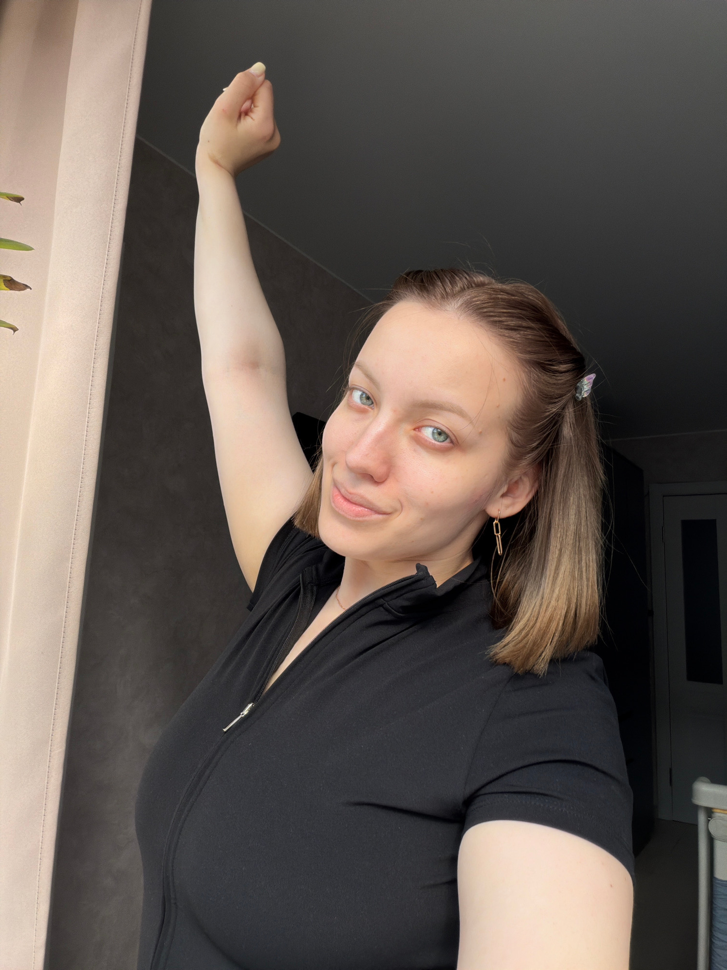 A young woman is the central subject of this close-up selfie, captured indoors. She has fair skin, light-colored eyes, and light brown hair styled in a ponytail, secured with a small iridescent clip.…read more