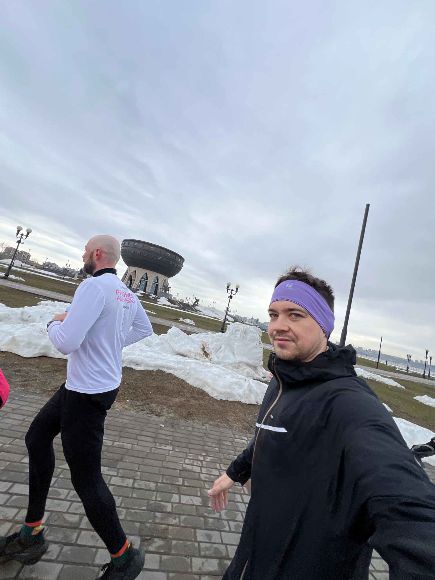 Two men stand on a brick-paved path in Kazan, Russia. One man wears a black jacket, a purple headband, and stands in the foreground, facing the camera. Behind him and to the left, the second man wears…read more