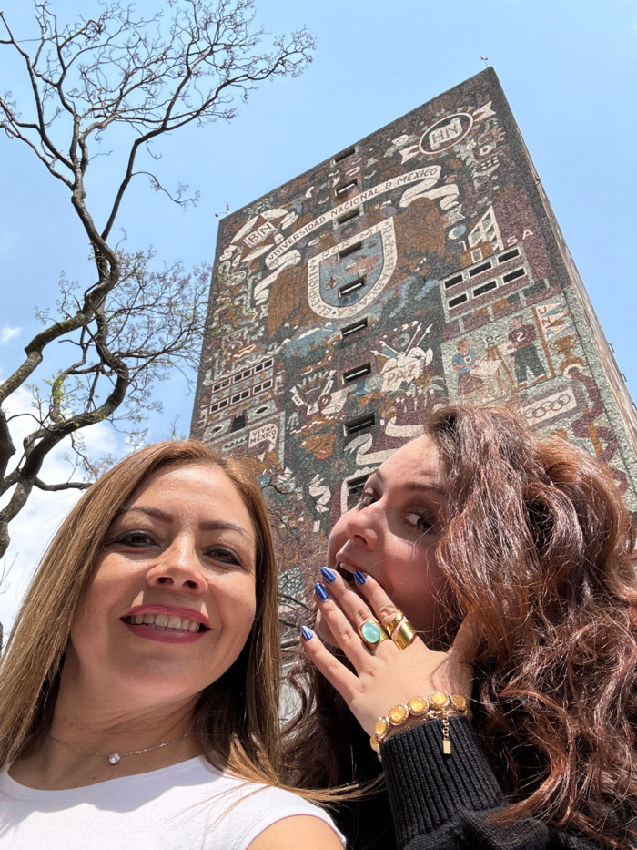 Two adult females are depicted in a selfie-style photograph taken in Mexico City, Mexico, with the Central Library of the National Autonomous University of Mexico (UNAM) serving as the backdrop. The lā¦read more