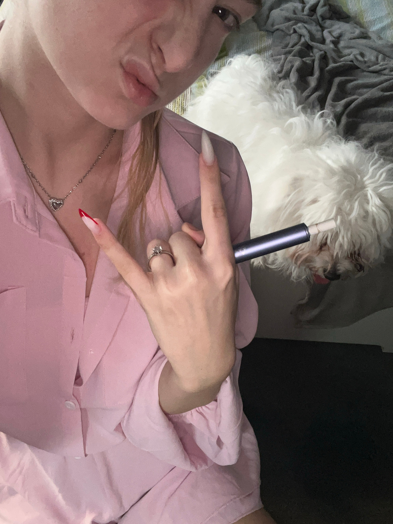 A selfie taken indoors. A woman wearing a pink button-down shirt and a heart necklace, with long fingernails (one has red tips), is posing with a 'rock on' hand gesture. She has fair skin and blonde h…read more