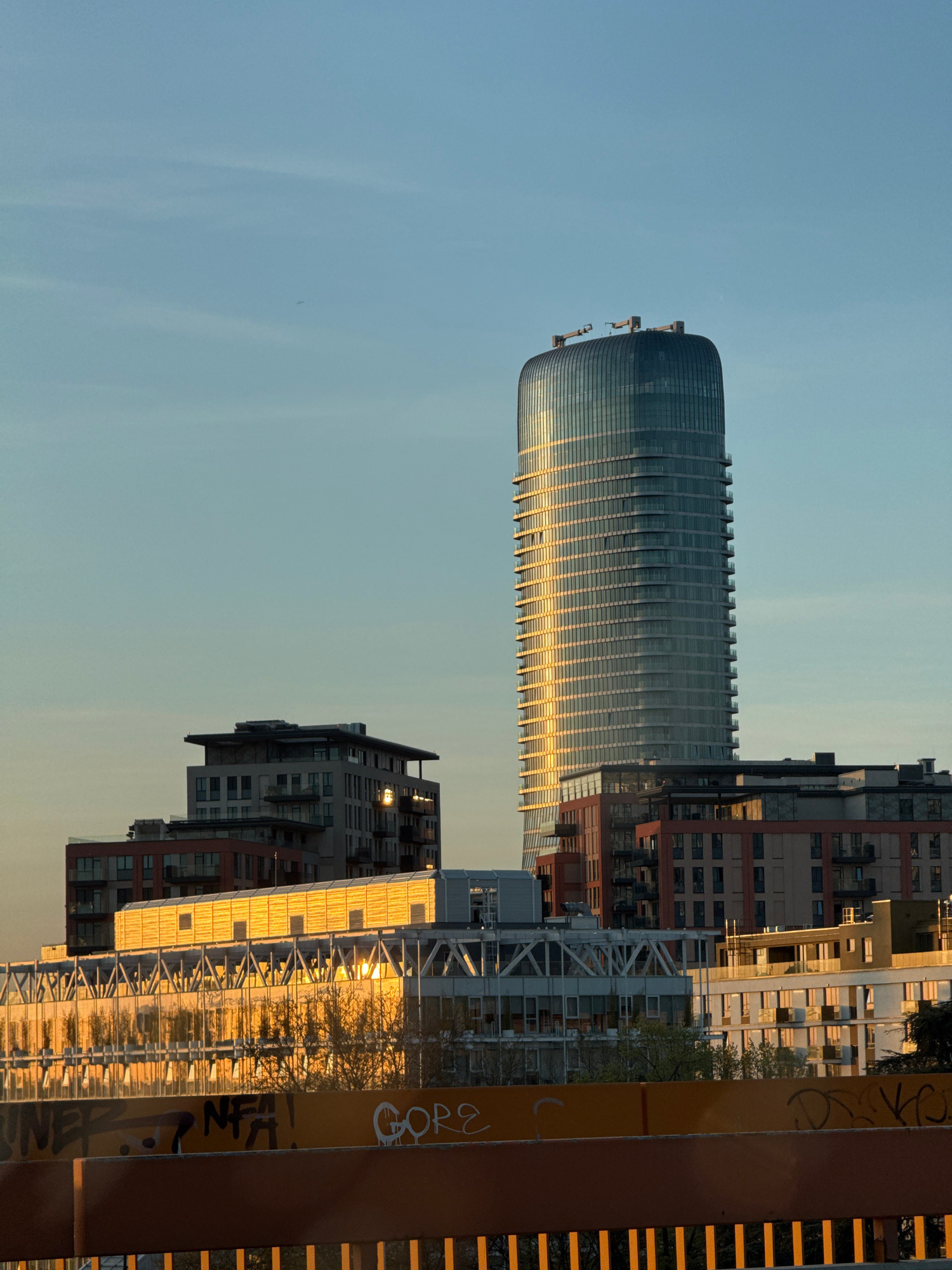 The image shows a tall, cylindrical building with a curved top, its surface reflecting golden light, likely at sunset. Next to it are other buildings with varying heights and architectural styles. In…read more