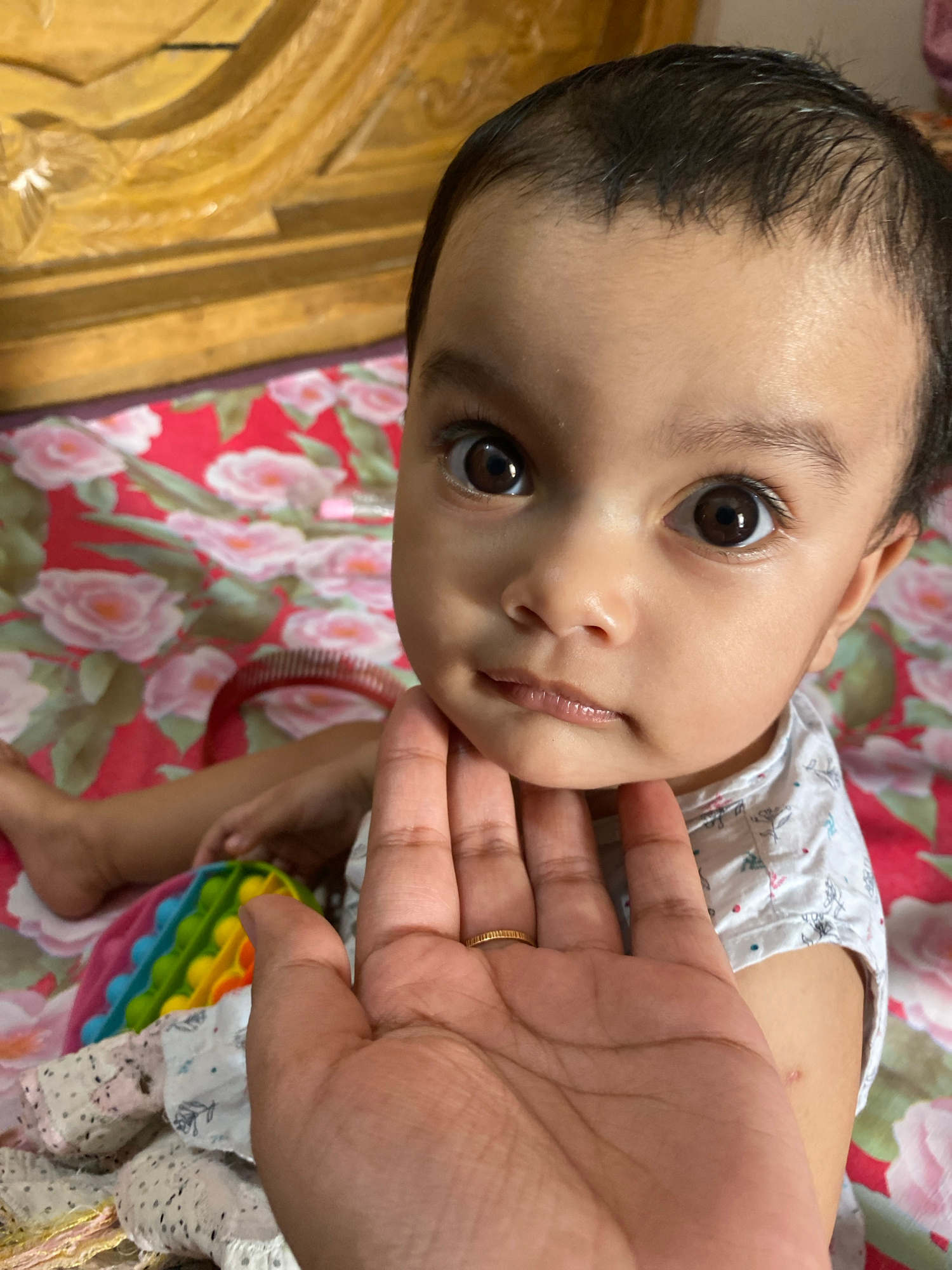A close-up, high-angle shot captures a young child, likely an infant or toddler, lying or sitting on a floral-patterned surface. The child is the primary subject, looking directly at the camera with l…read more
