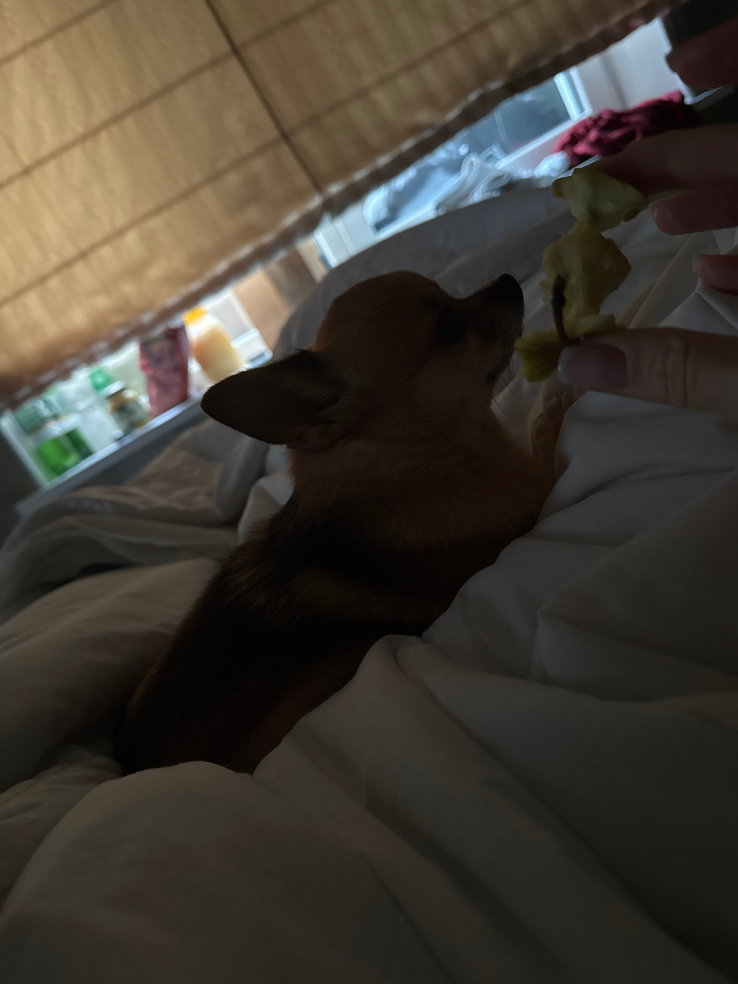 A brown dachshund is lying in a bed covered in white sheets and comforter, as a person hand-feeds it a light-colored food, possibly apple, inside of a refrigerator.