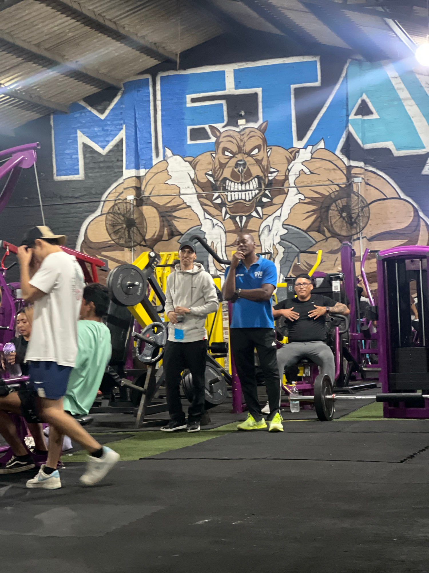 The image shows a group of at least six people posing inside a gym in Arica, Chile. The gym's wall is decorated with a large mural featuring a blue and gray "A" and a muscular bulldog. Several individβ¦read more