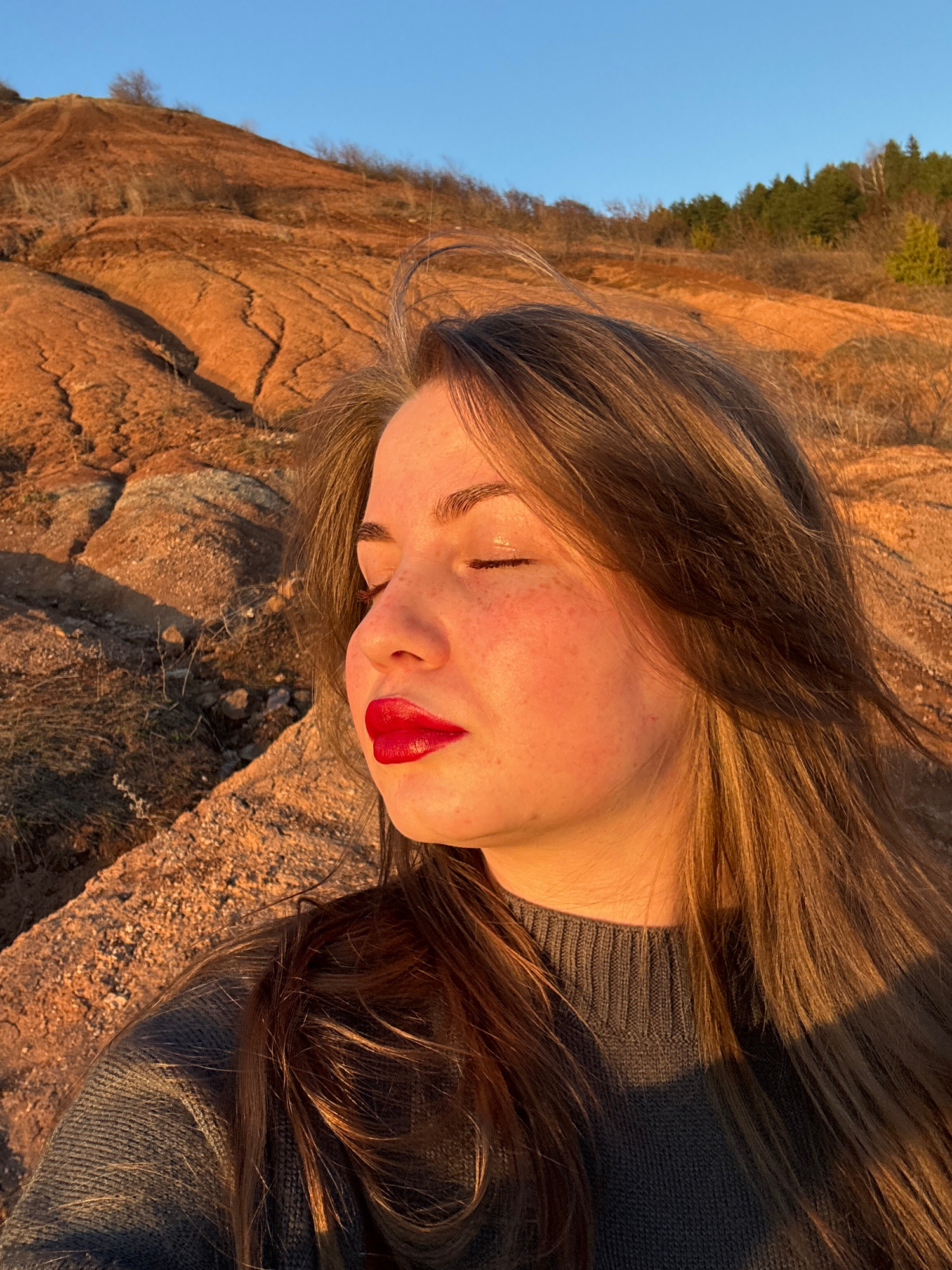 A young woman with fair skin, freckles, and long brown hair lies on her side on a rocky surface in Ольховка, Russia. She wears a dark grey knit sweater and red lipstick. A rocky hill with sparse veget…read more