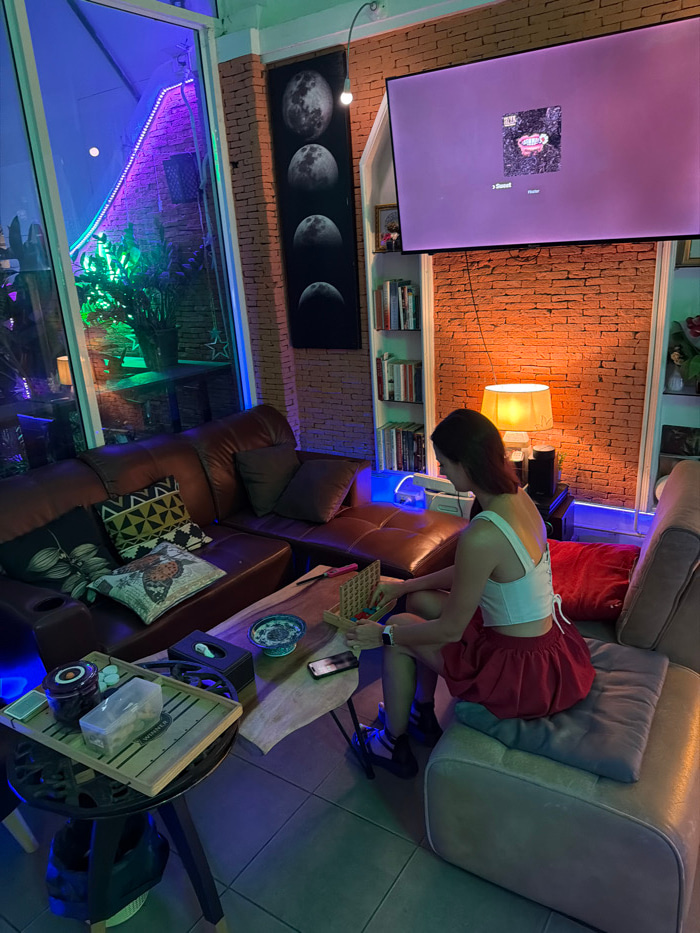 The image depicts an indoor establishment, likely a cafe or lounge, located in Pattaya City, Thailand. A female individual, positioned on the right, is seated on a light grey armchair with a cushion,…read more