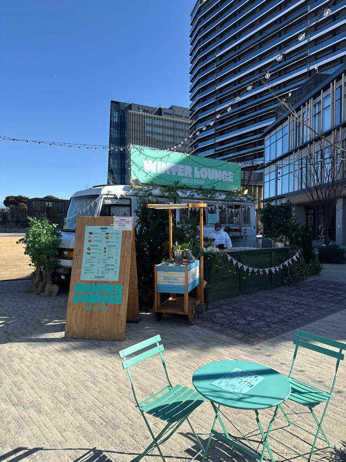 A blue outdoor table and chairs sit on a paved surface next to a "Winter Lounge Meiji Park" food truck. The truck has a menu board displayed in front and a small cart with "Corona Cerveza" branding. A…read more