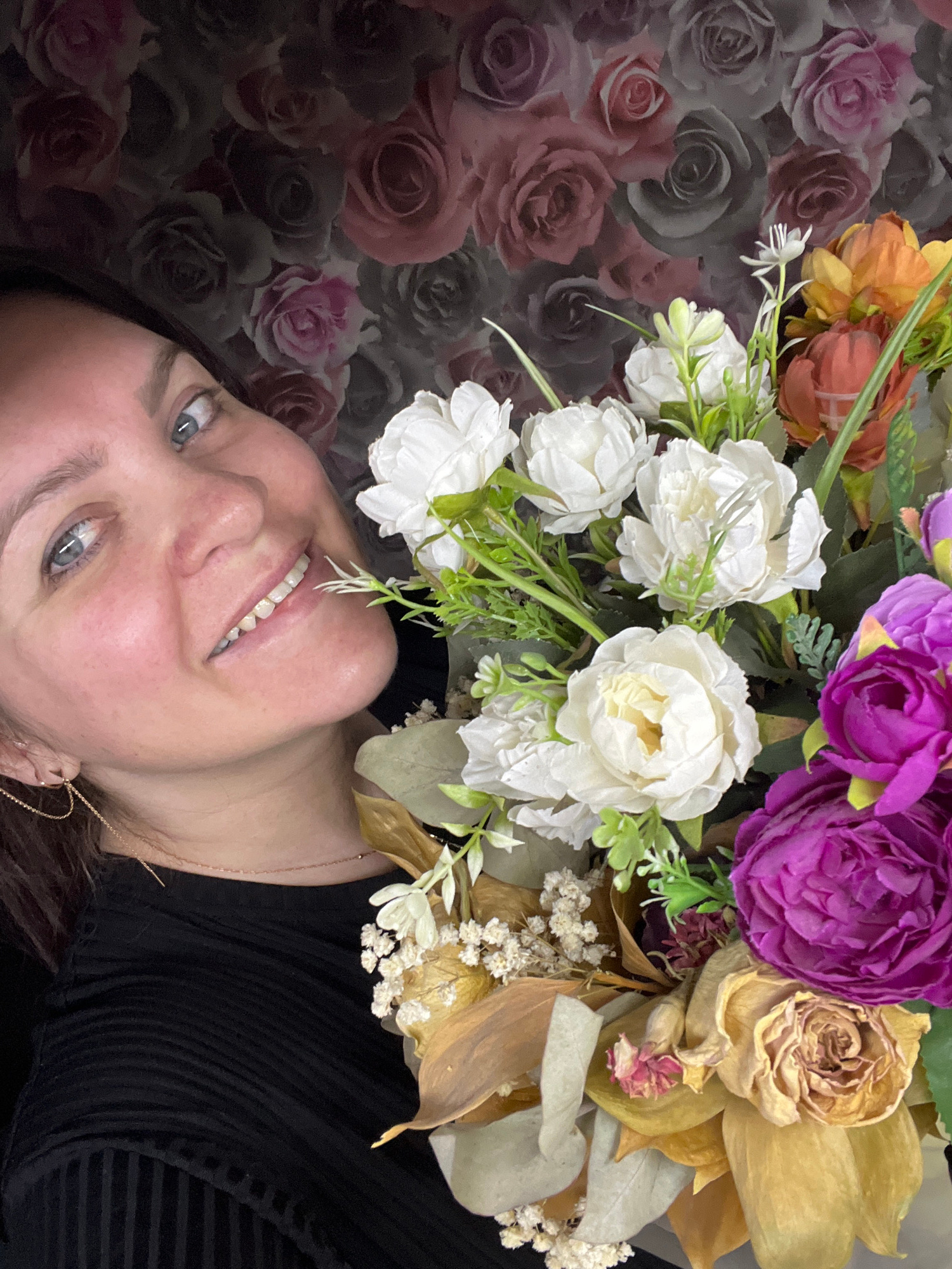 A woman lies on a floral-patterned surface, with a bouquet of flowers positioned above her head. The bouquet contains white, purple, orange, and beige flowers. The woman is wearing a black shirt. A th…read more