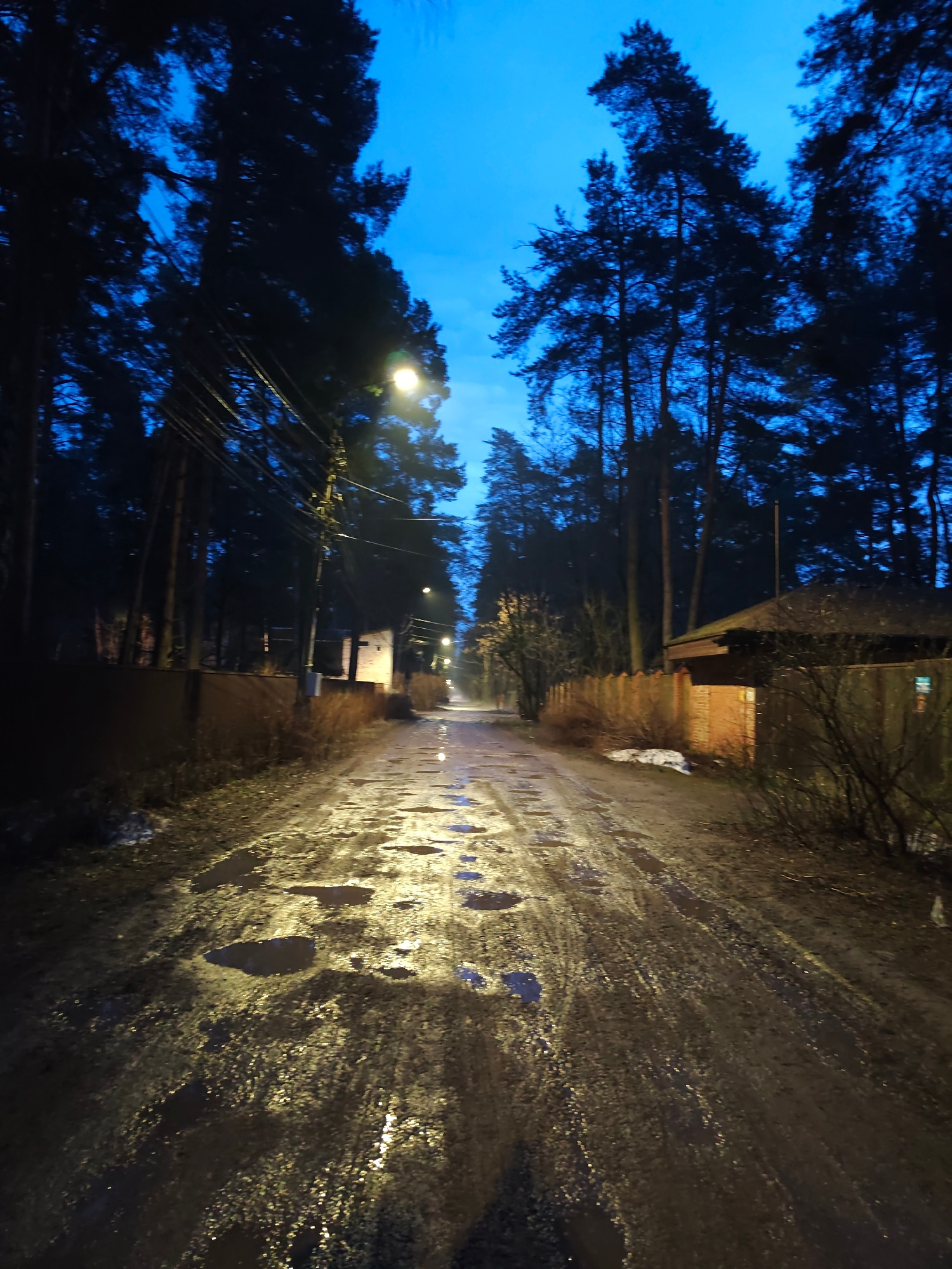 The image shows a dirt road in Kratovo, Russia at twilight. The road is lined with tall trees on both sides, partially obscuring buildings and fences. Streetlights illuminate the road, reflecting in n…read more