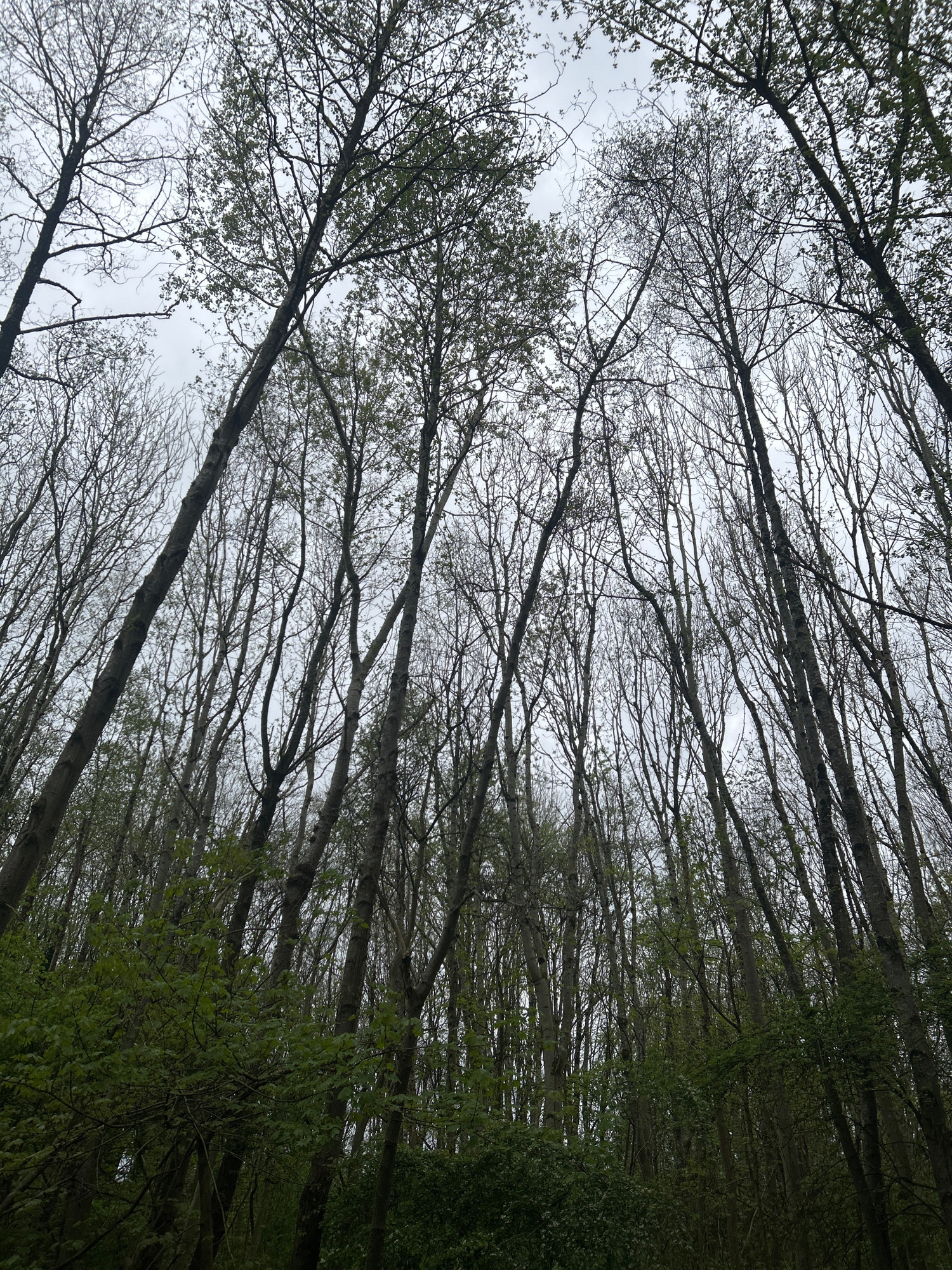 The image captures an upward view into a dense canopy of trees, filling the entire frame against an overcast sky. Numerous tall tree trunks and their complex network of bare branches dominate the scen…read more