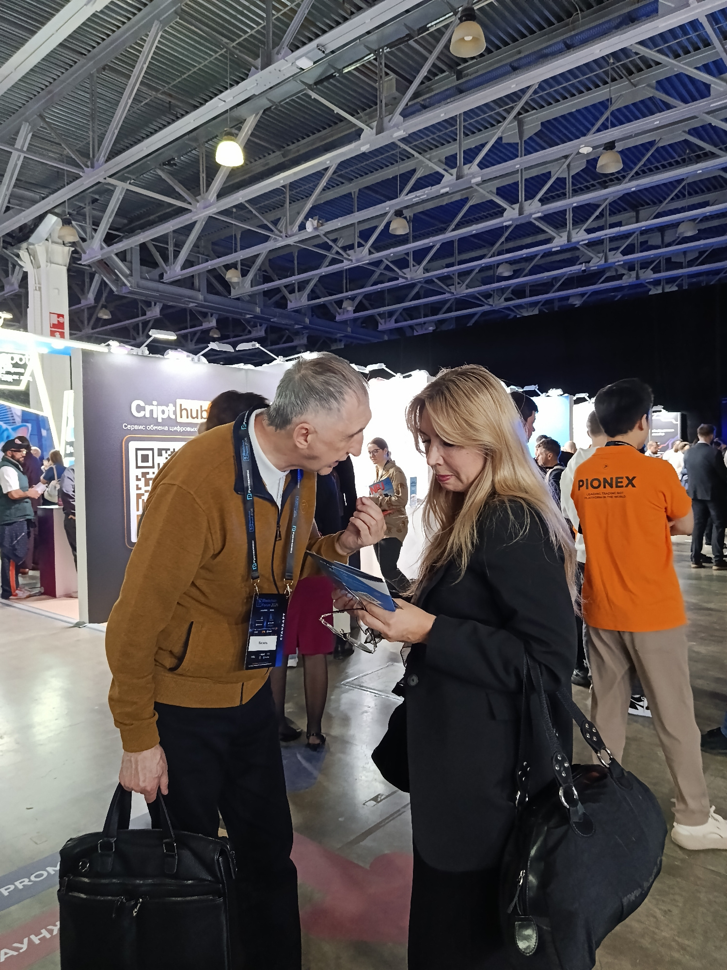 The image shows two people, a man and a woman, standing and talking at what appears to be a conference or trade show. The man is on the left, wearing a brown jacket, black pants, and carrying a black…read more
