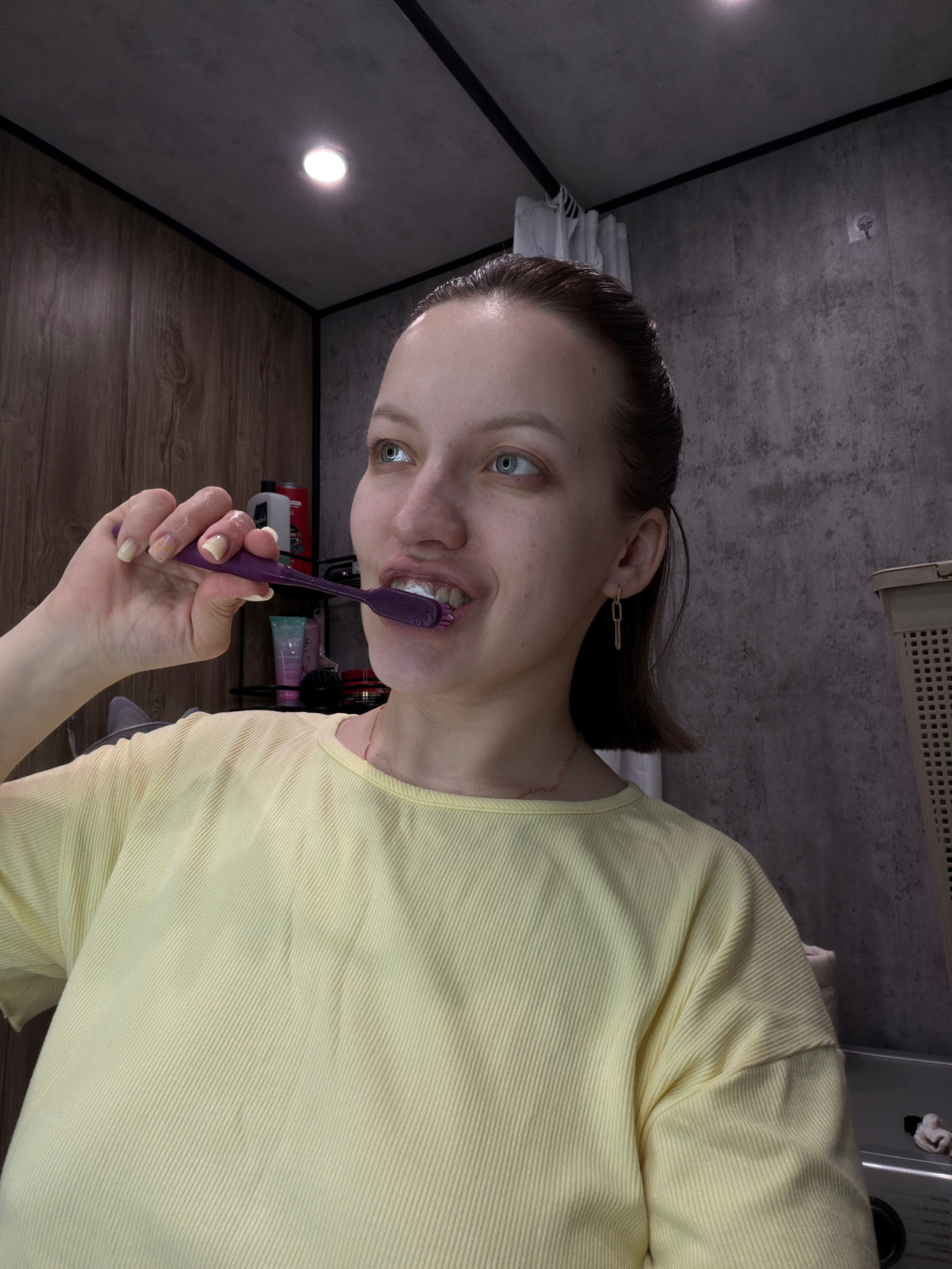 A woman with fair skin and light eyes is brushing her teeth. She is wearing a light yellow shirt and a gold chain necklace. Her hair is pulled back. She holds a purple toothbrush with white toothpaste…read more