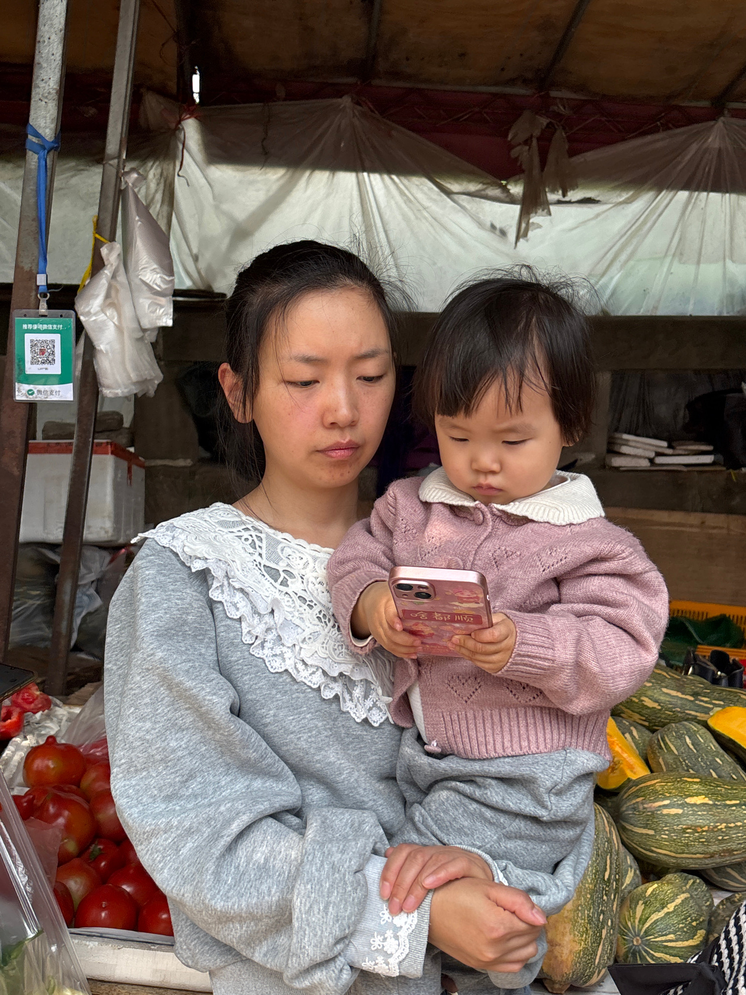 A woman and a young child are depicted in what appears to be a market setting. The woman, wearing a gray sweatshirt with a white lace collar, holds the child, who is dressed in a pink knitted sweater…read more