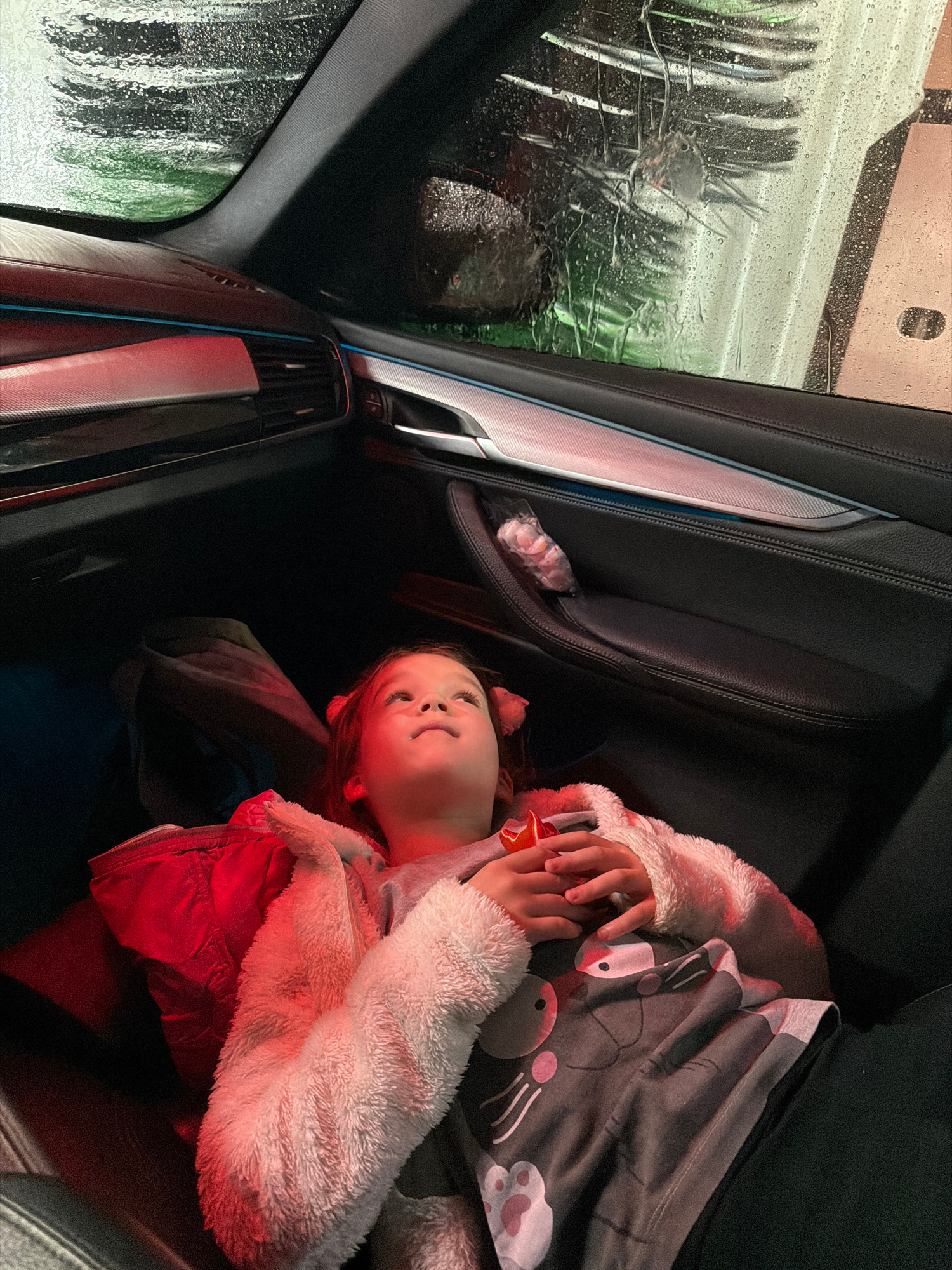 A young child, wrapped in a fuzzy white jacket and covered with a grey blanket printed with a cartoon animal design, is seen inside a car during a car wash. The car wash brushes and soapy water are vi…read more