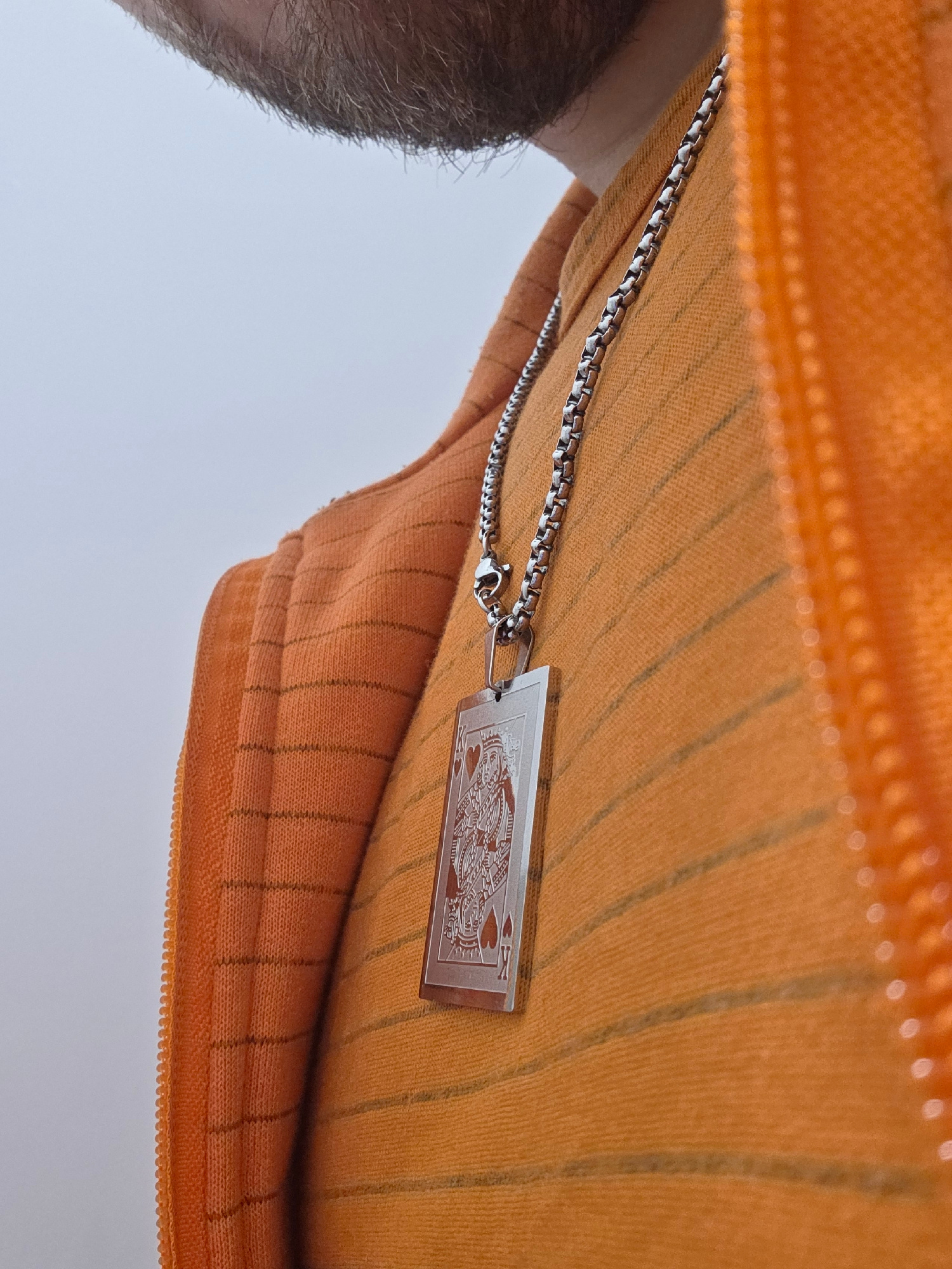 A close-up shot focuses on the upper torso of a person wearing an orange, horizontally striped zip-up hoodie, complemented by a silver necklace. The pendant is a rectangular shape, intricately designe…read more