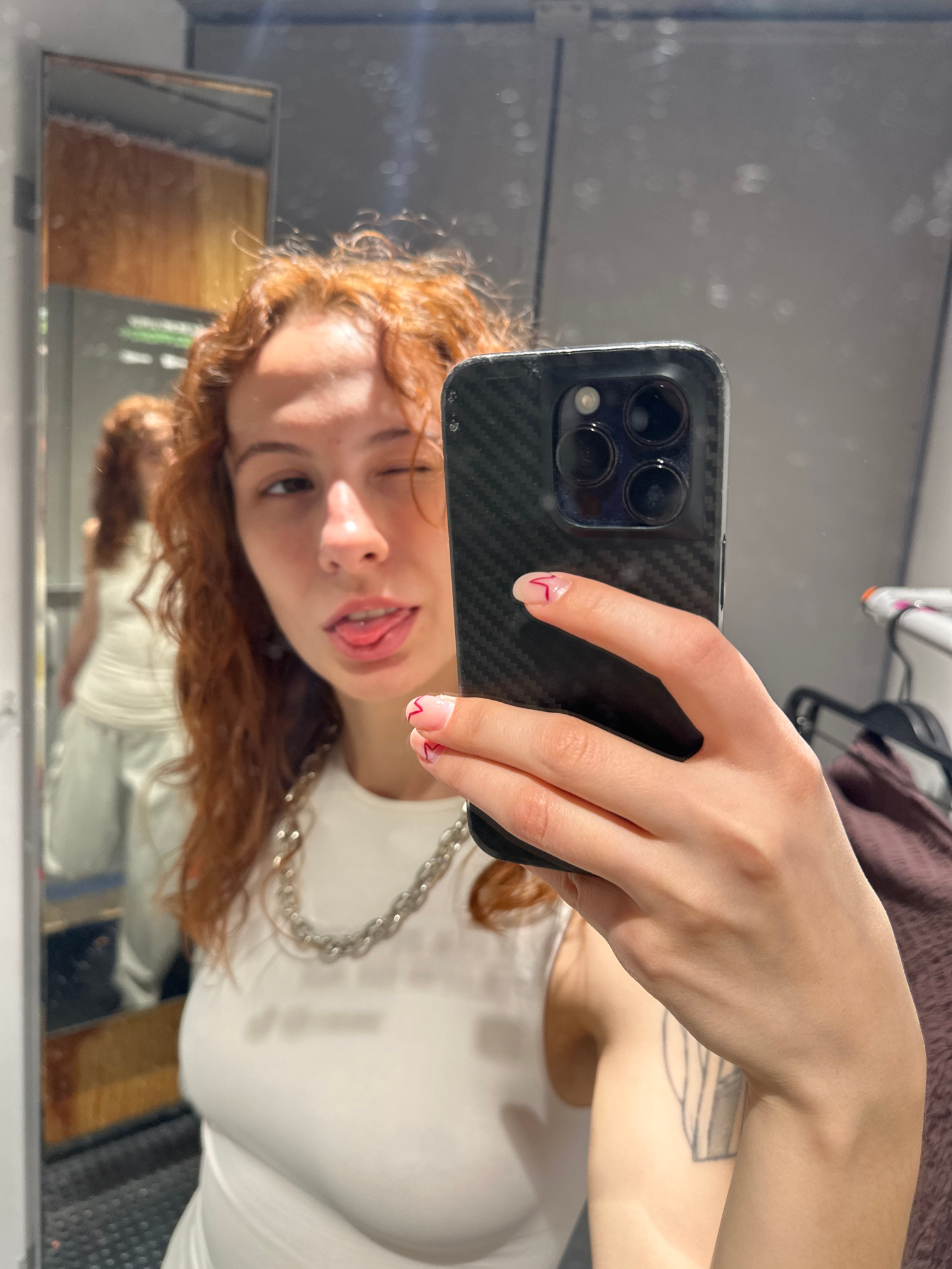 A young woman is taking a selfie in a mirror. She has red hair, fair skin, and is wearing a white tank top and a silver chain necklace. Her nails are painted with a minimalist red design. She is holdi…read more