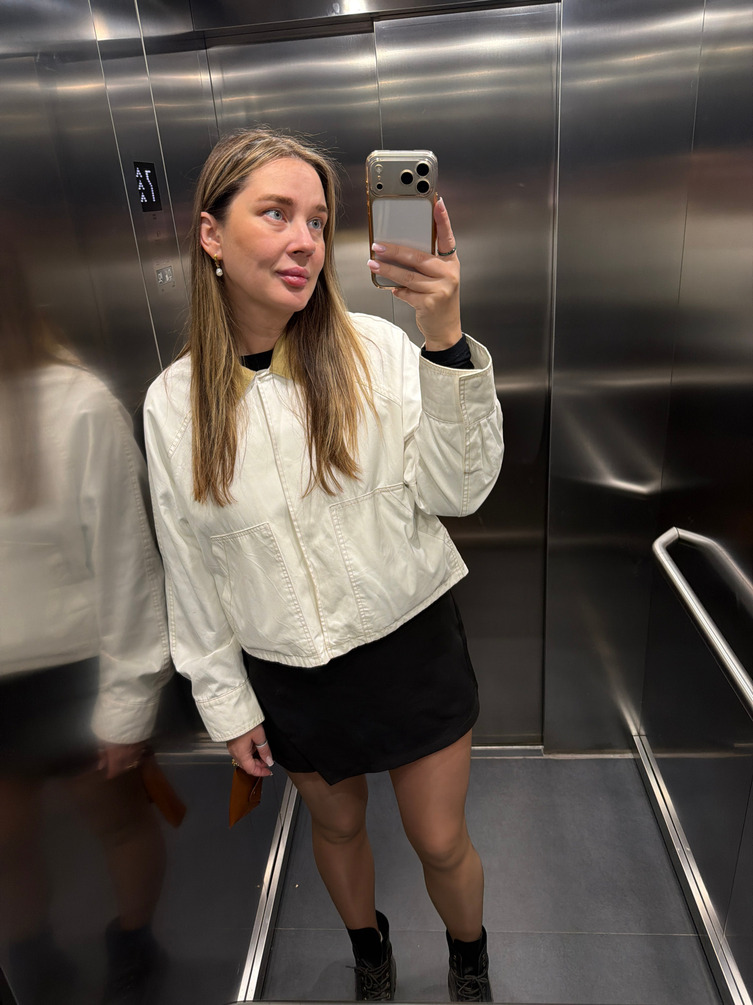 A woman is taking a selfie in an elevator. The elevator has stainless steel walls and a grey floor. The woman is wearing a black dress, a white jacket, and black boots. She is holding a cell phone in…read more