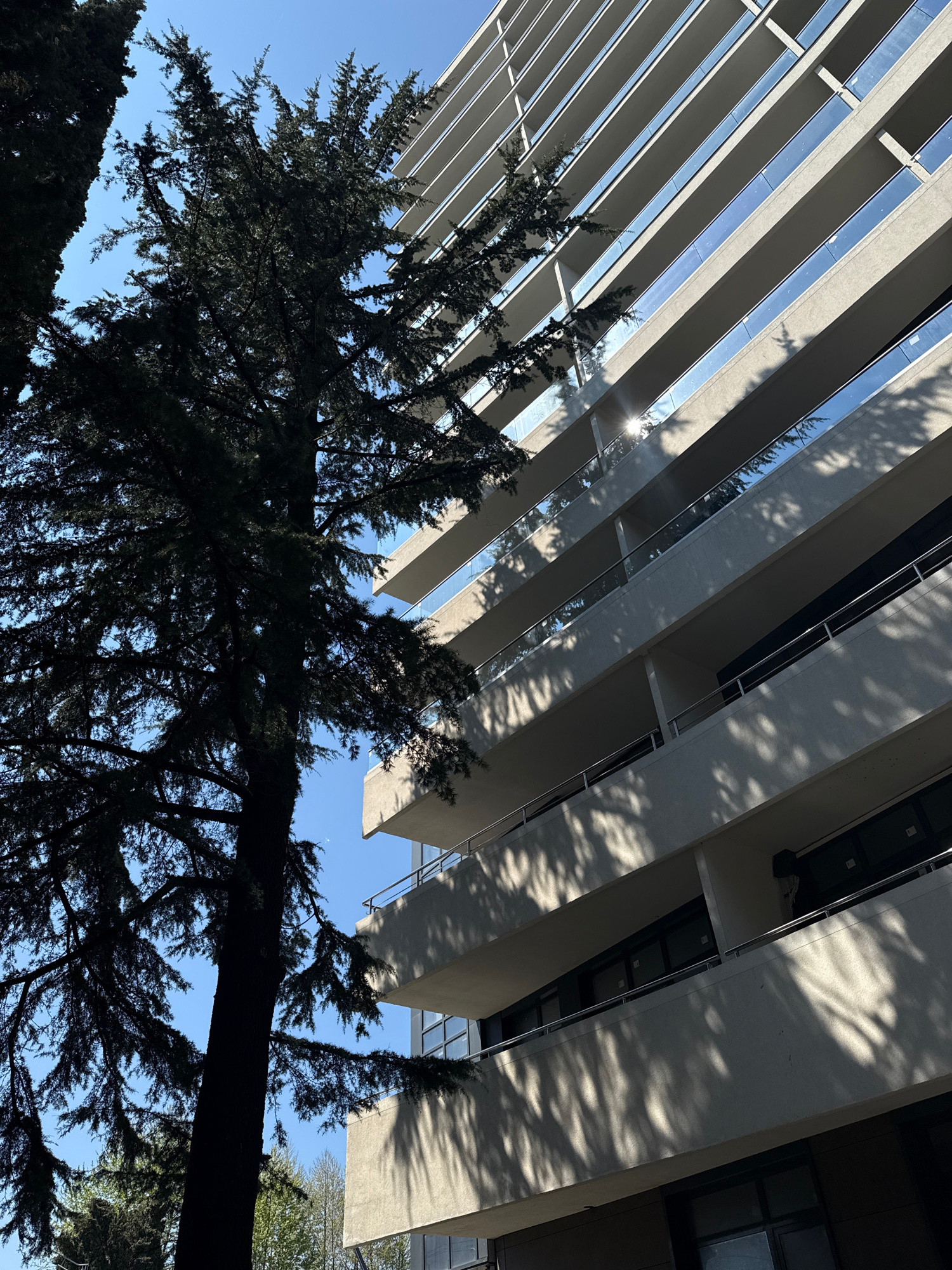 The image shows a view looking up through the branches of a tree toward a modern architectural structure. The structure consists of horizontal, rectangular panels that appear to be spaced to allow sun…read more