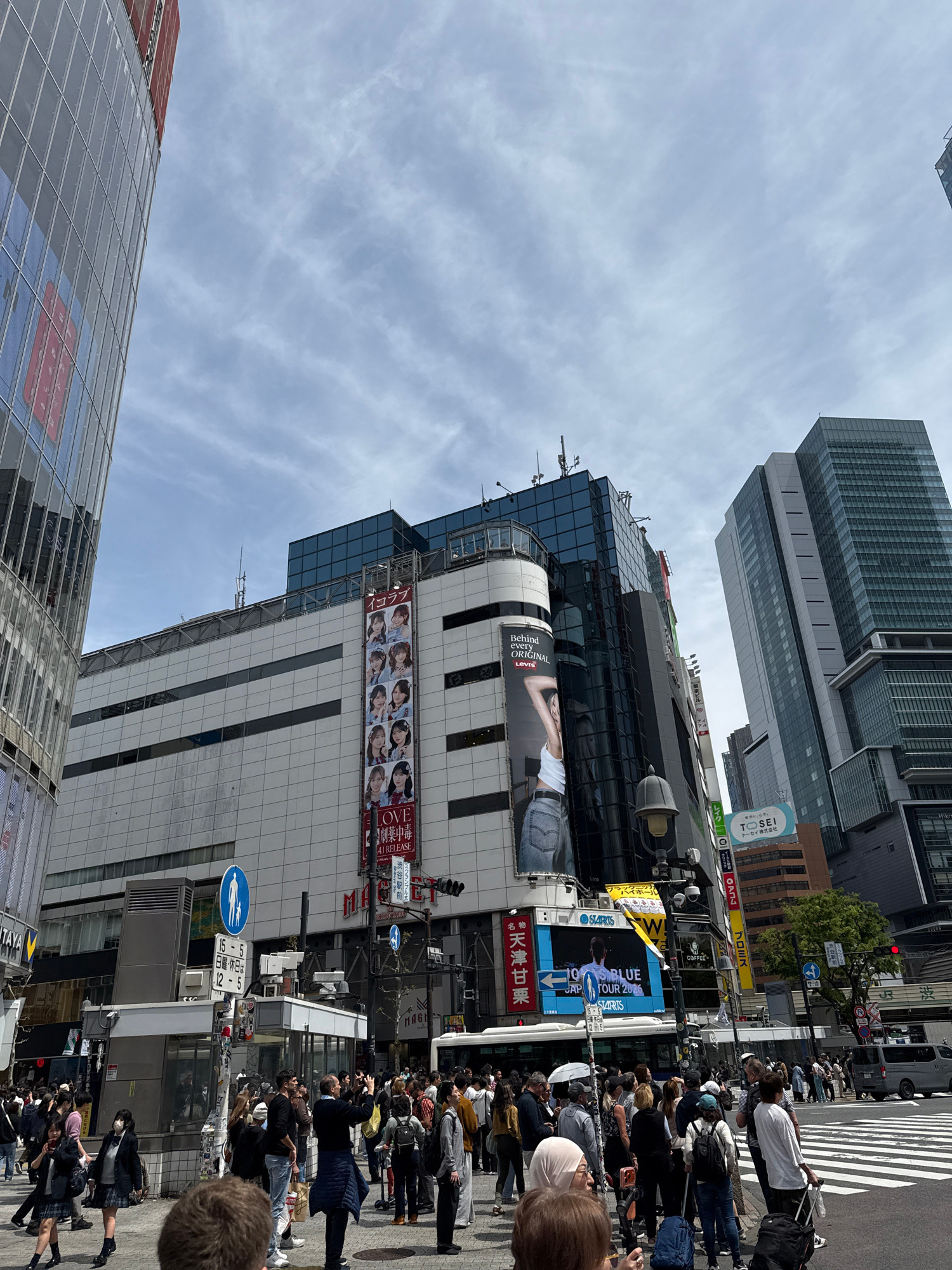 The image, originally captured in portrait orientation, depicts a bustling urban street scene in Shibuya, Japan, characterized by modern high-rise buildings under a partly cloudy sky. Numerous pedestr…read more