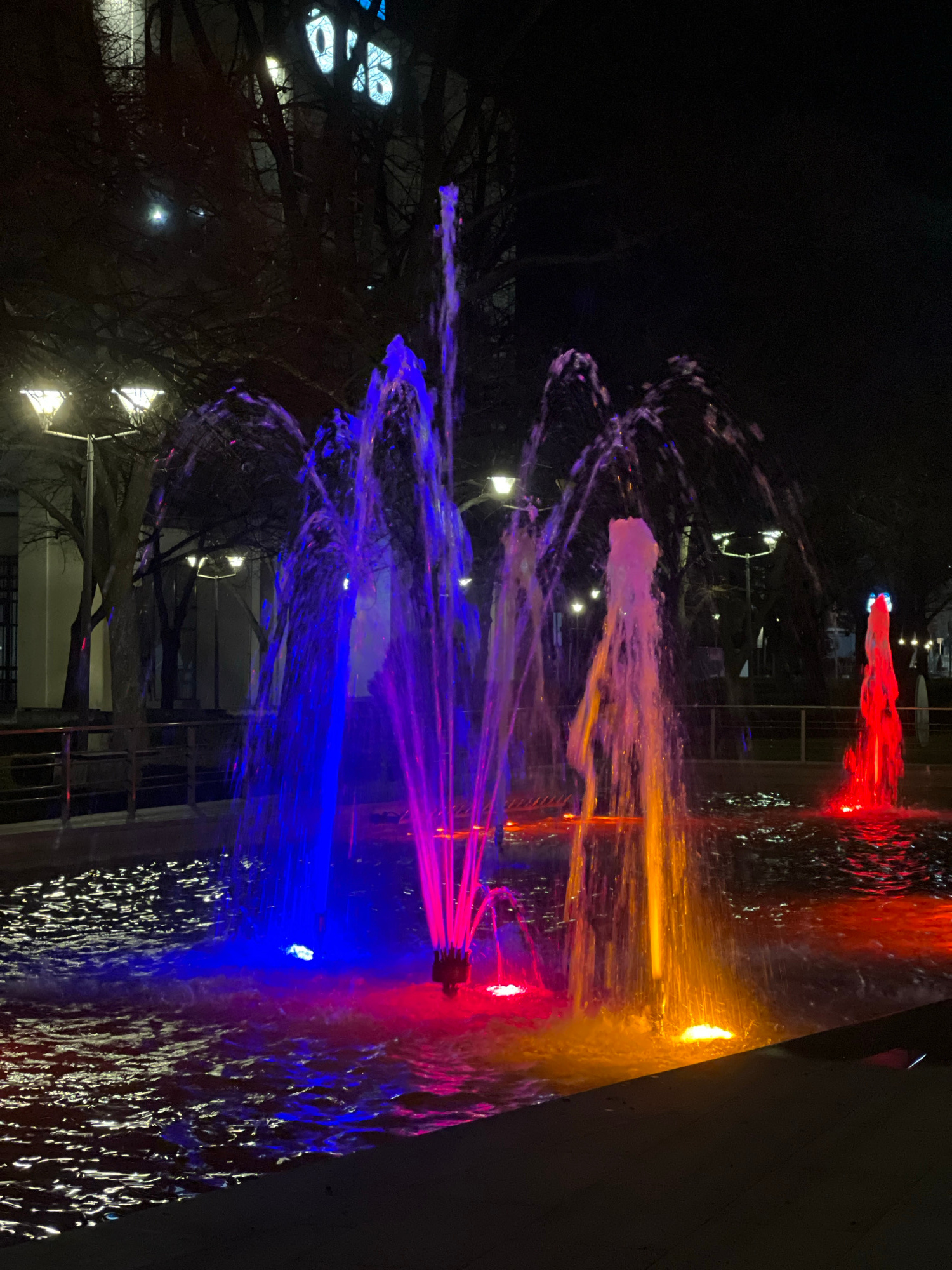 A night shot depicts a vibrant, illuminated fountain in Pernik, Bulgaria. The water jets are illuminated in an array of colors, including red, orange, yellow, purple, and blue. The water reflects theβ¦read more