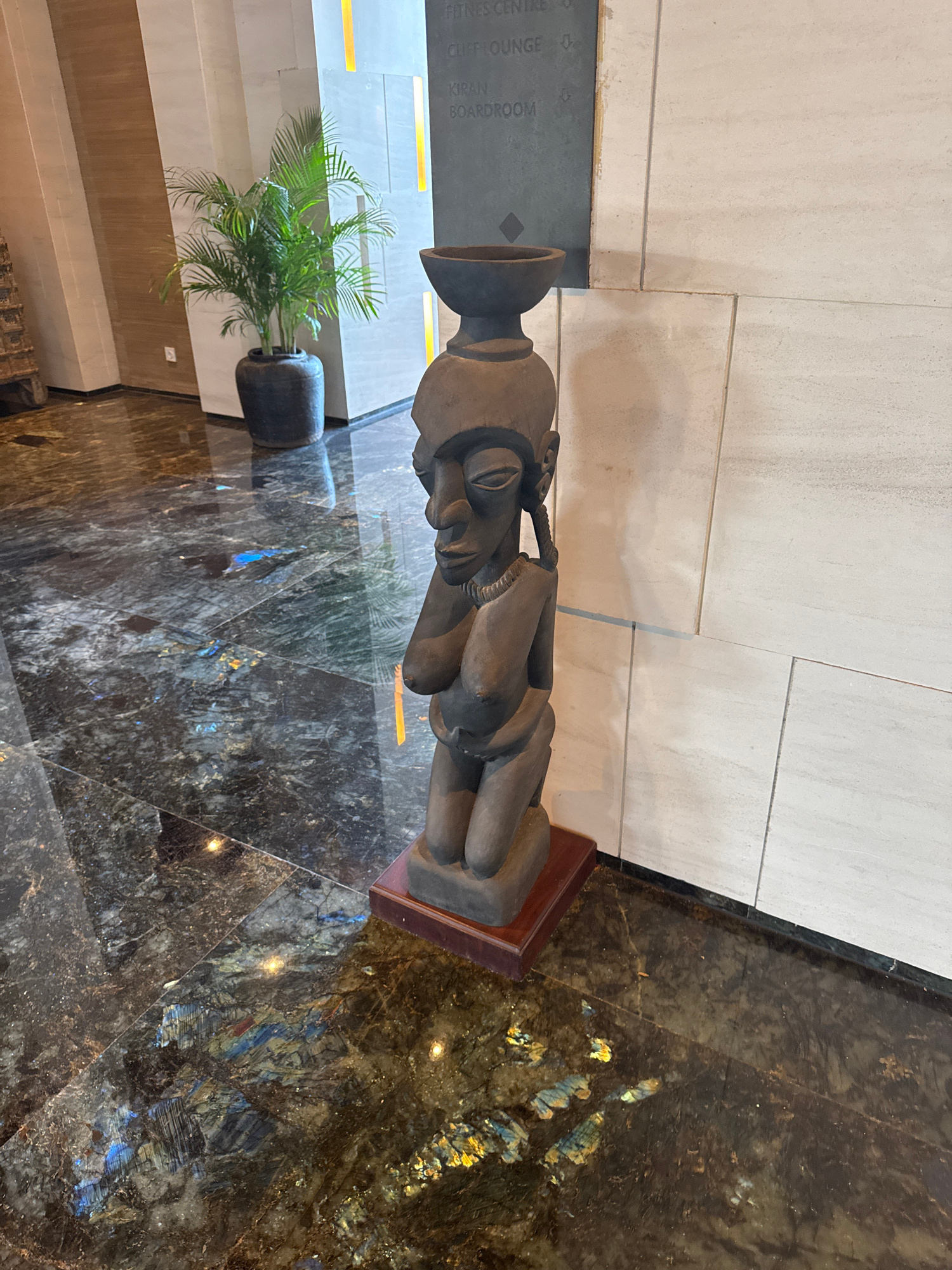 The image depicts an indoor scene in Kuta Selatan, Indonesia, featuring a carved wooden sculpture displayed on a wooden base. The sculpture is located near a potted plant and a stone wall, alongside a…read more