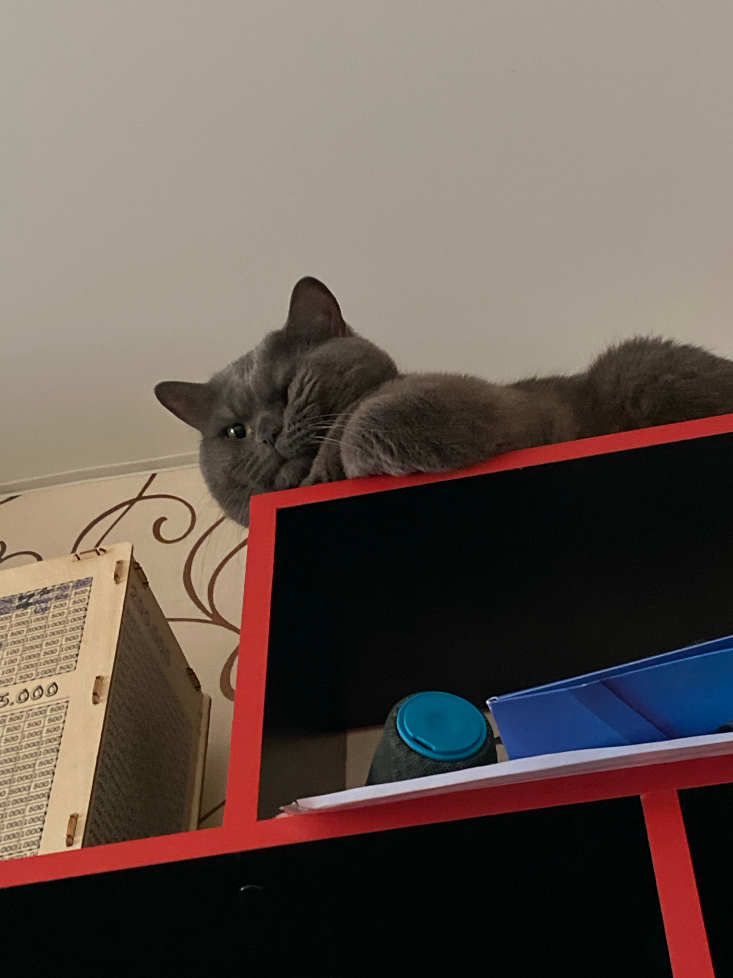 A gray cat is seen from below, its head angled down towards the viewer. It is positioned partially behind a red and black shelf unit, with a blue container and a blue folder visible on one of the shel…read more