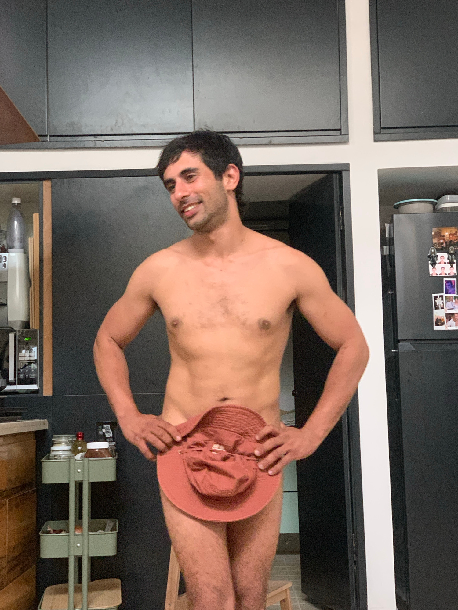 An adult man, with dark hair and a beard, is standing shirtless in what appears to be an indoor domestic setting, possibly a kitchen or living area, consistent with a residence in Tel-Aviv. The image…read more