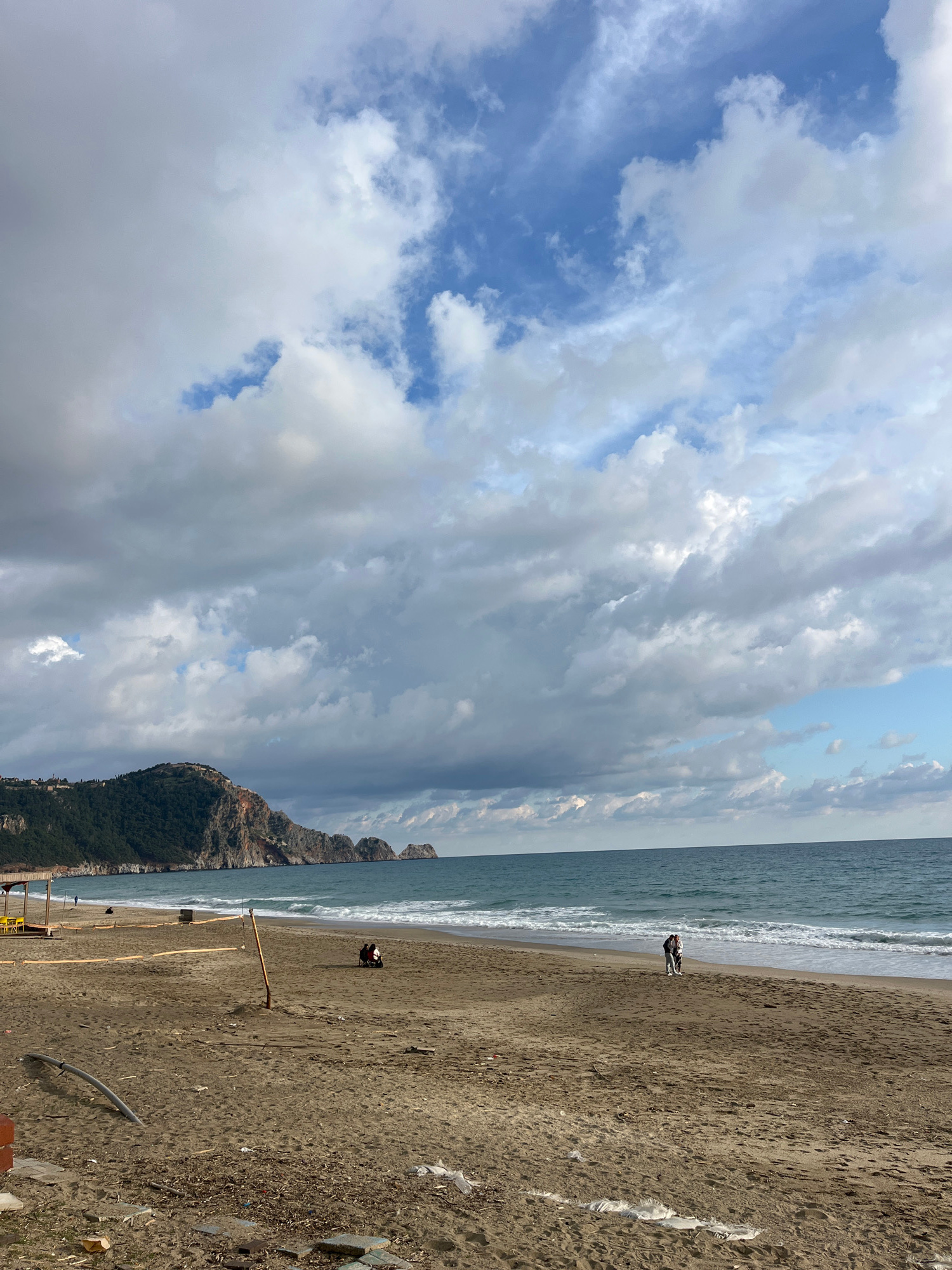 The image captures a beach scene in Alanya, Turkey. A mountain covered with vegetation rises beside the beach. The sky is filled with dramatic cloud formations, ranging from light to dark hues. The sandy beach stretches out towards the sea, where waves are visible. Two individuals can be seen standing near the water's edge. Closer to the foreground, another person is seated on the sand. A wooden structure with yellow elements is present on the beach. Debris, including pieces of wood and other discarded items, are scattered on the sand, particularly towards the right side of the frame. | Open Wire