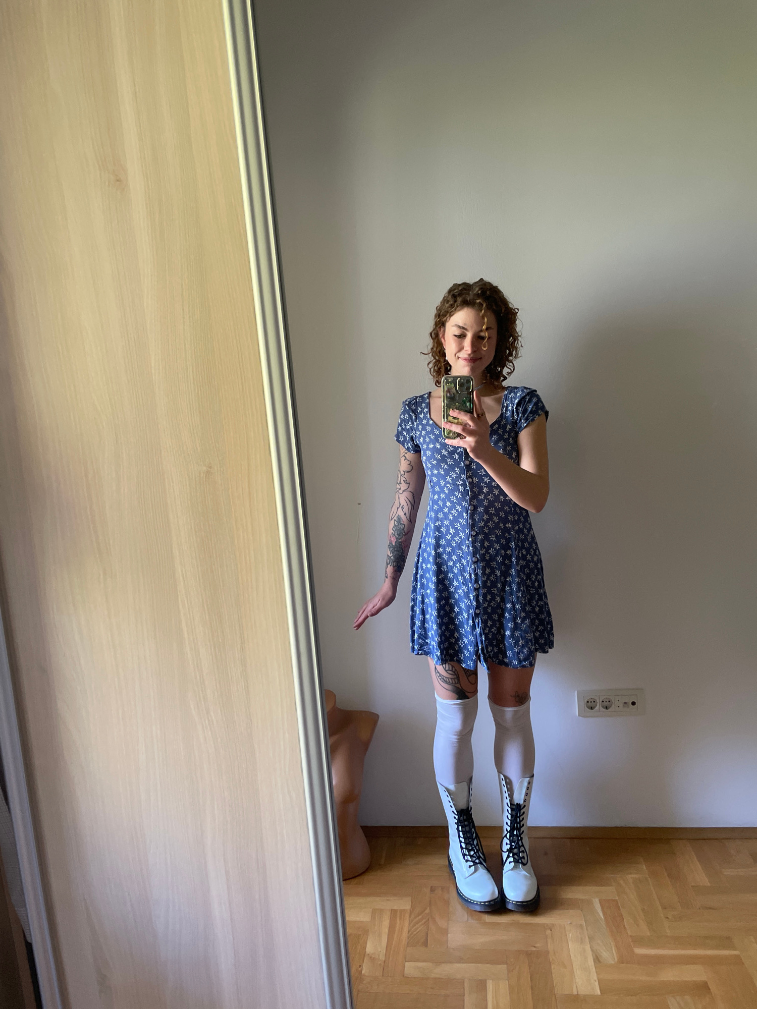 A young woman is reflected in a mirror. She is wearing a short, blue, floral dress, white knee-high socks, and white boots. She is holding a cell phone, apparently taking a picture of herself. The bac…read more
