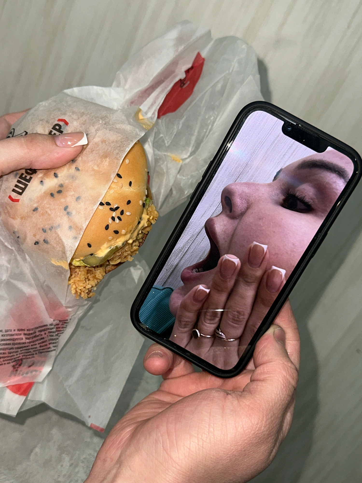 The image shows a person holding a smartphone in their right hand, displaying a close-up image of a woman with her mouth open and hand near her face. The person is also holding a burger in a wrapper w…read more