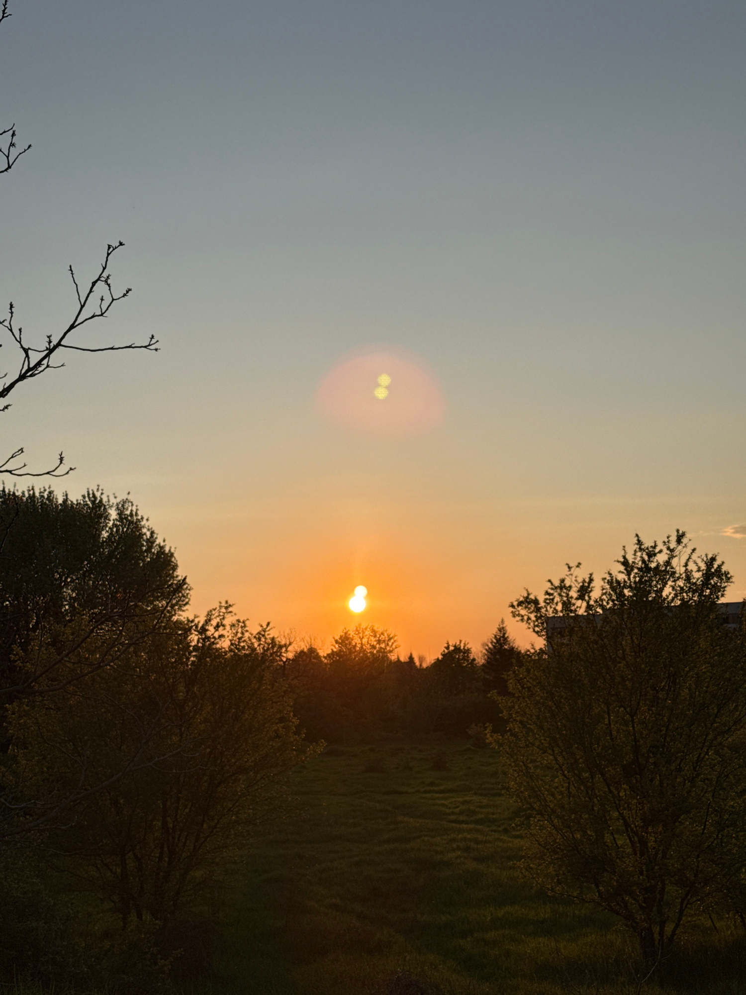 The image shows a sunrise over a field in Pleven, Bulgaria. The sun is low on the horizon, casting a golden glow over the sky. Trees frame the right side of the image, and bare branches are visible in…read more