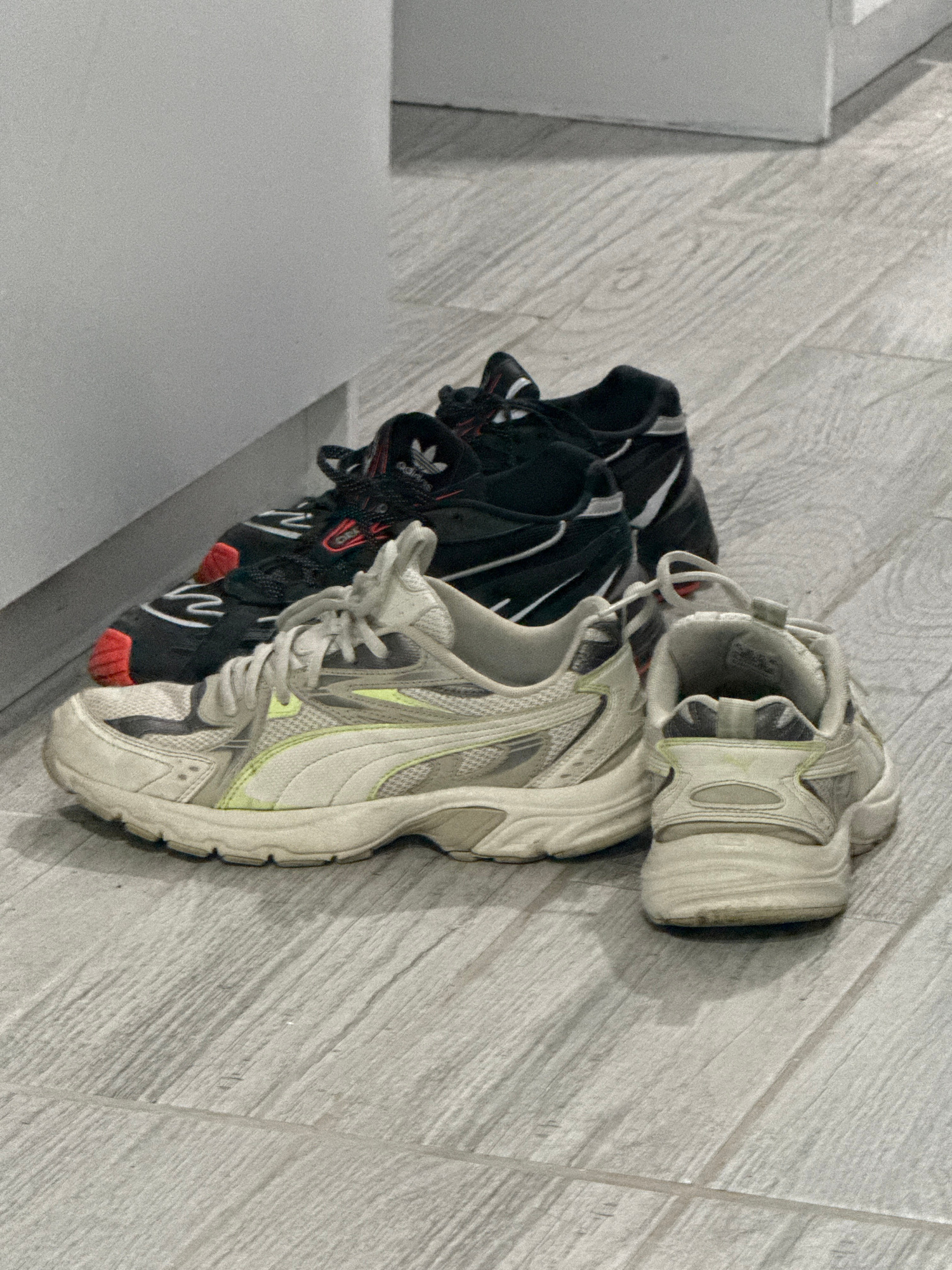 The image shows three pairs of sneakers stacked on a grey, tiled floor. The bottom pair is black with red accents and the Adidas logo visible. The middle pair is white and grey with lime green detailsβ¦read more