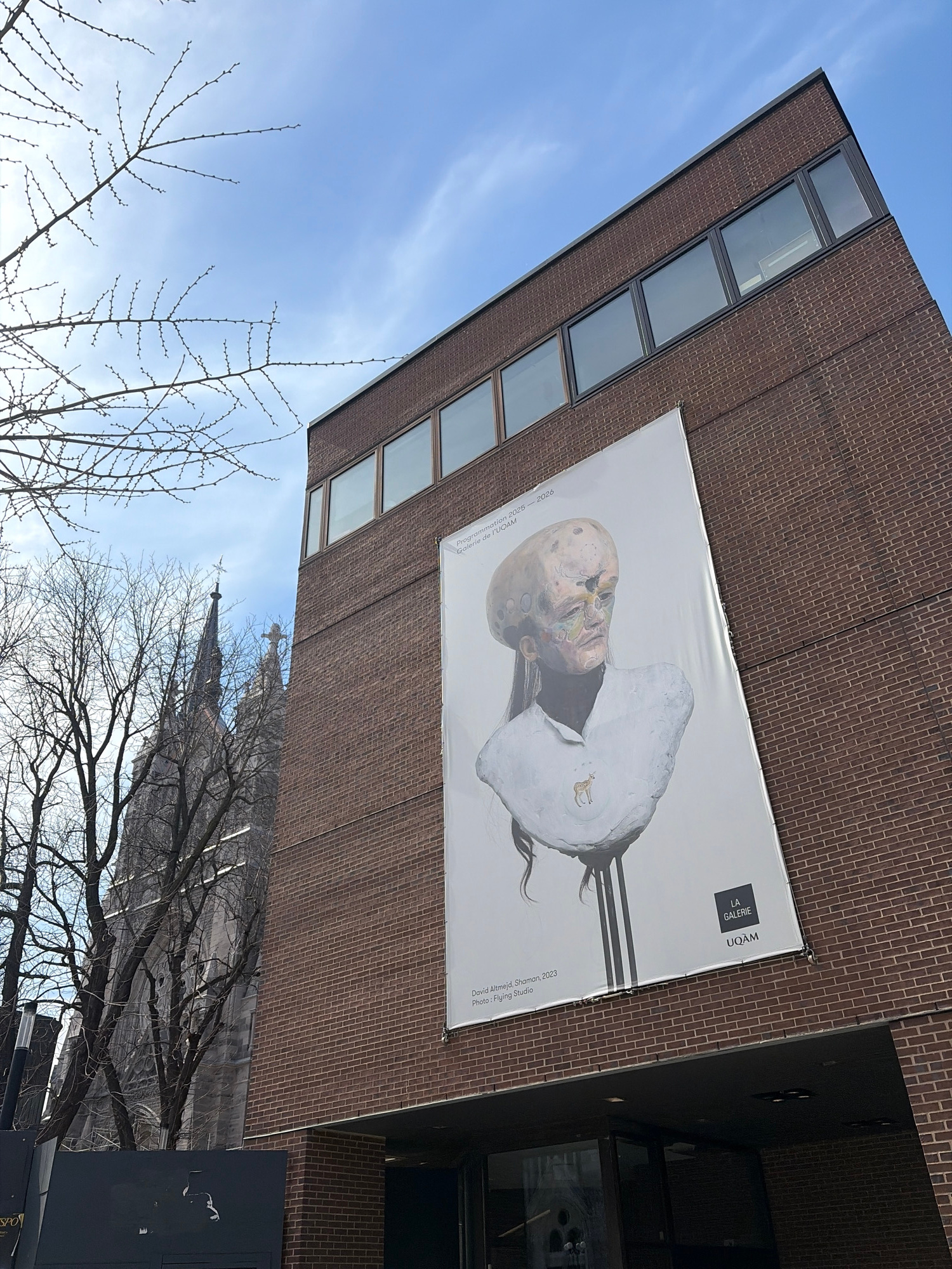 The image depicts a large advertisement for an art exhibition, "David Altmejd, Shaman, 2023," at La Galerie UQAM, located in Montreal, Canada. The poster is attached to the exterior brick wall of a mo…read more