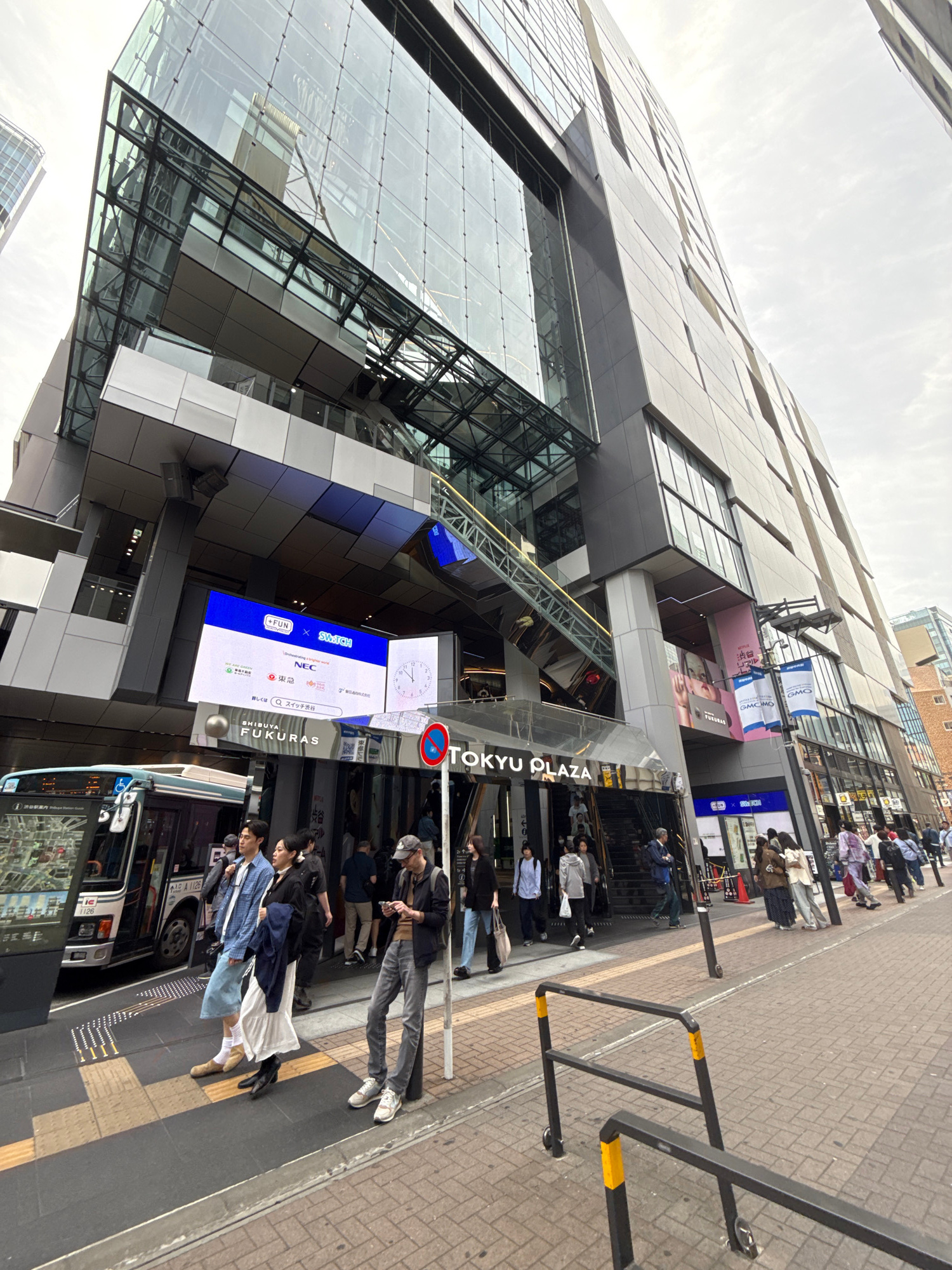 The image shows the exterior of the Tokyu Plaza in Shibuya, Japan, with a crowd of people waiting in line outside the entrance. The modern building has a glass facade and a large digital display showi…read more