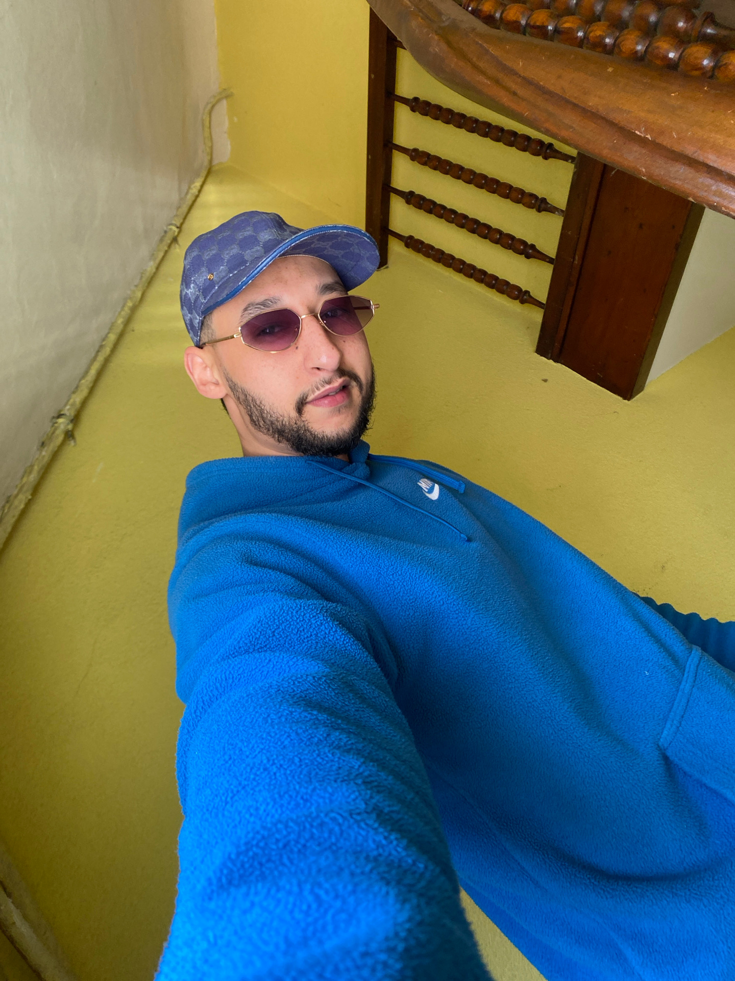 A male with a beard and sunglasses is standing in an indoor location. He is wearing a blue hoodie and a patterned cap. The walls are painted yellow. Part of a wooden staircase is visible in the backgr…read more