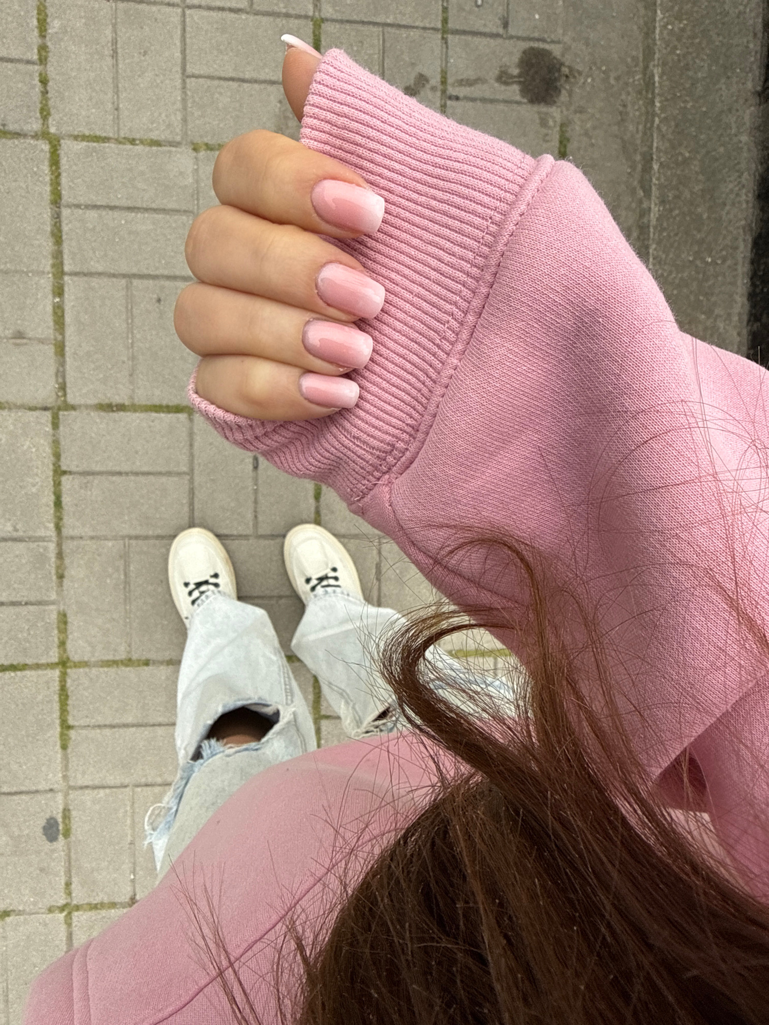 The image is a first-person perspective shot taken outdoors. The subject is wearing a pink hoodie and distressed light-wash jeans with holes at the knees, paired with white sneakers with black accents…read more