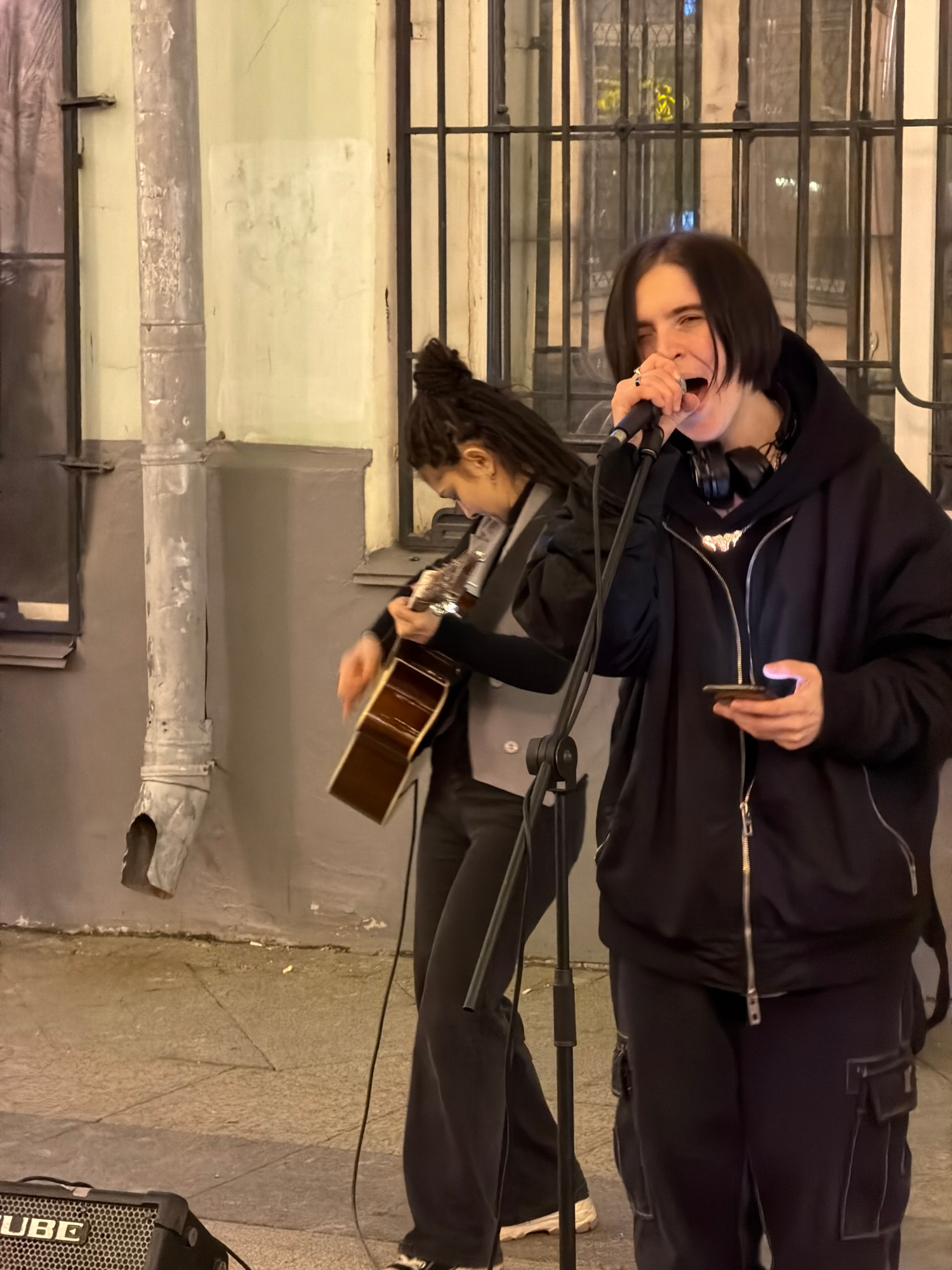 Two musicians are performing on the street, illuminated by streetlights. The foreground shows architectural details of the building behind them. The person on the upper part of the image sings into a…read more