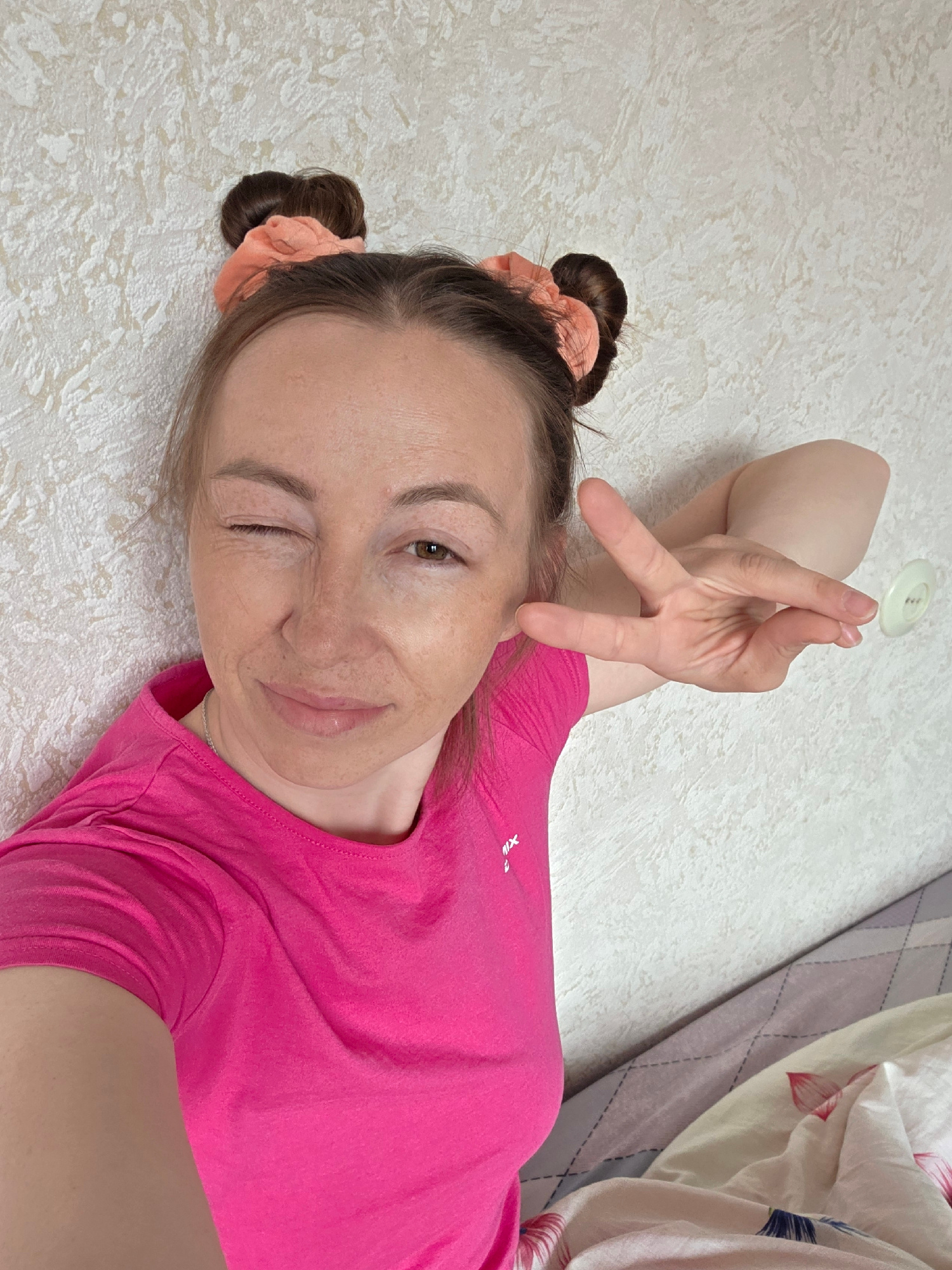 A woman is lying on a bed, winking at the camera and holding up a peace sign. She is wearing a pink t-shirt and has her hair in two buns with pink scrunchies. A white button lies near her hand. The be…read more