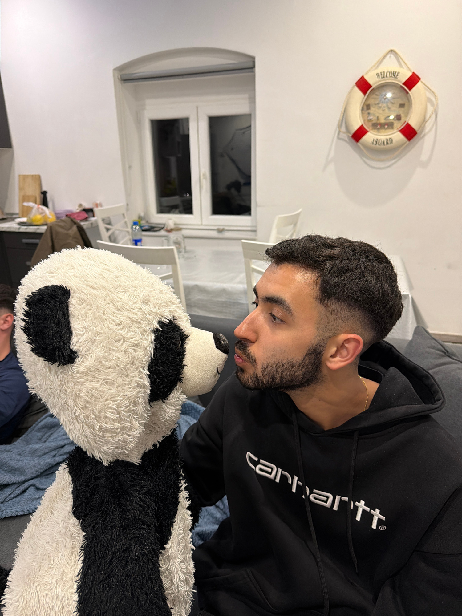 A person with short dark hair and a beard is looking down at a large, plush, black and white panda bear. The person is wearing a black Carhartt hoodie. They appear to be sitting on a grey sofa. A whit…read more