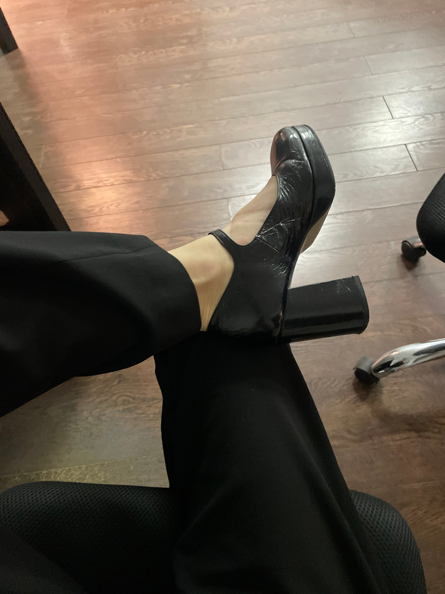 A high-angle, close-up shot captures a person's leg and foot, dressed in black, resting against a wooden floor. The individual is seated, with their left leg slightly extended, revealing a black paten…read more