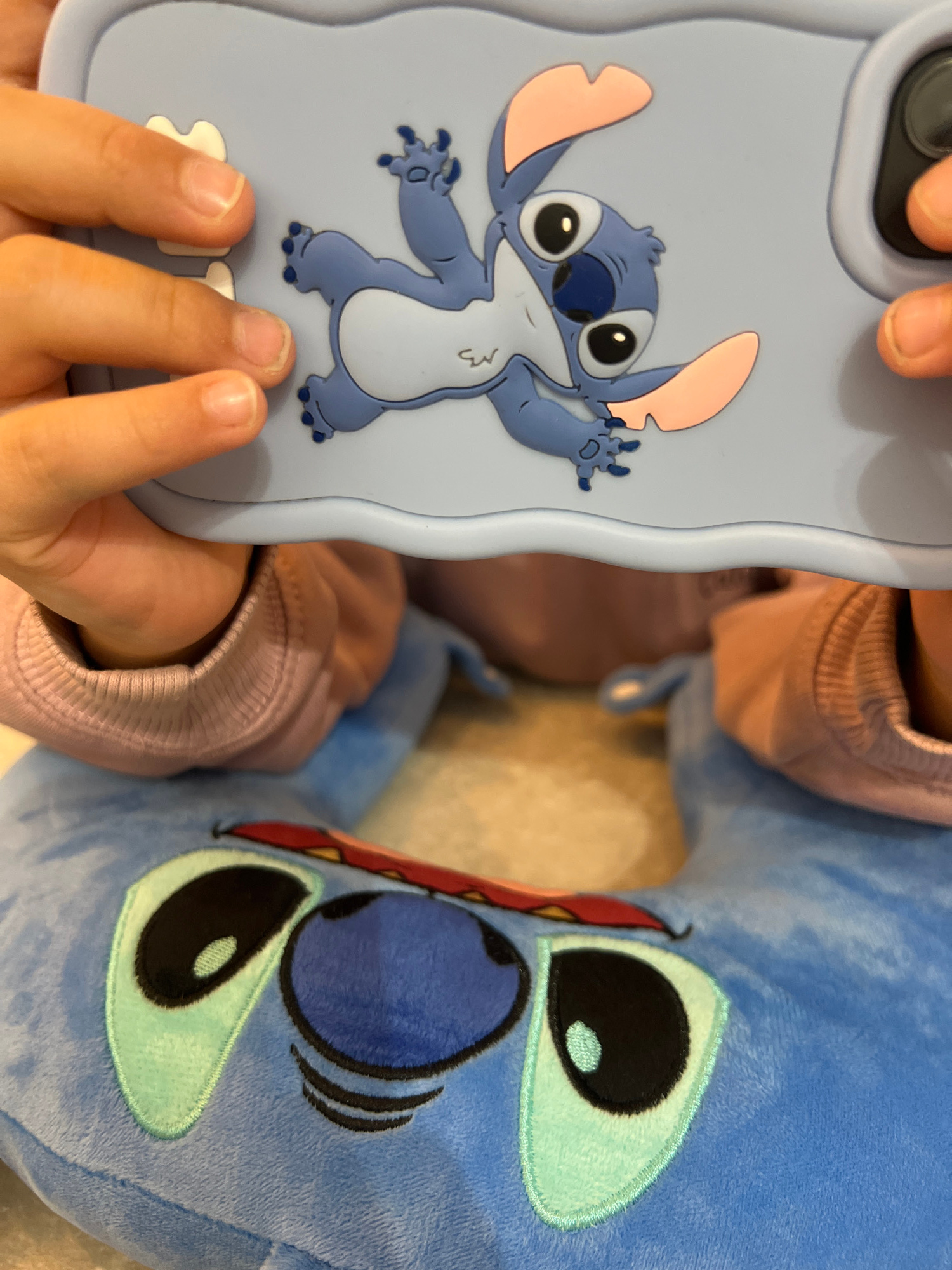 A close-up captures a child holding a light blue phone case with a cartoon rendition of Stitch on it. The phone case is held in front of a blue, plush Stitch toy. The child's hands and a sleeve of a p…read more