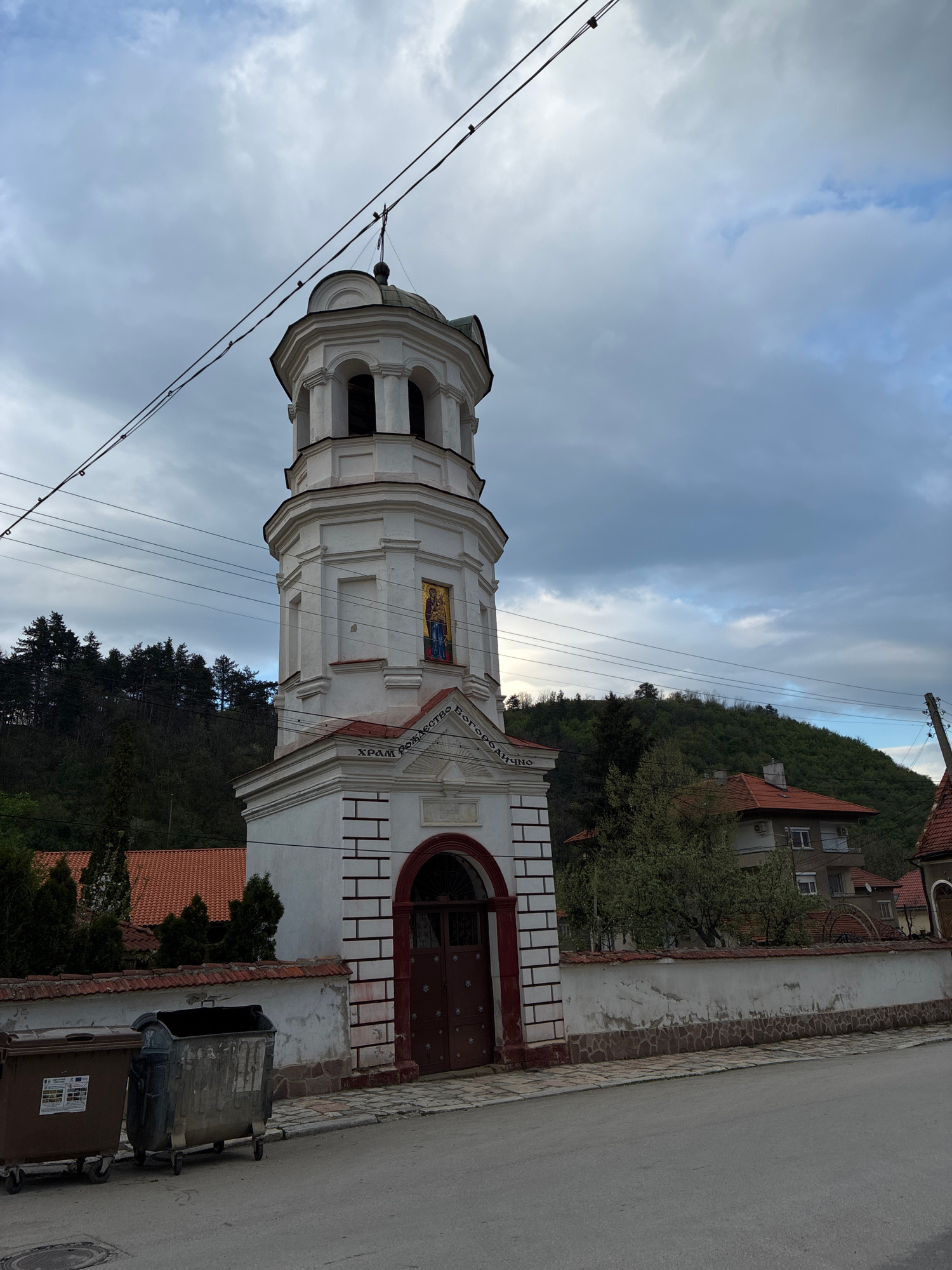 An exterior view captures a white Orthodox church bell tower and an adjacent building in Berkovitsa, Bulgaria, under an overcast sky. The prominent, multi-tiered bell tower, bright white with several…read more
