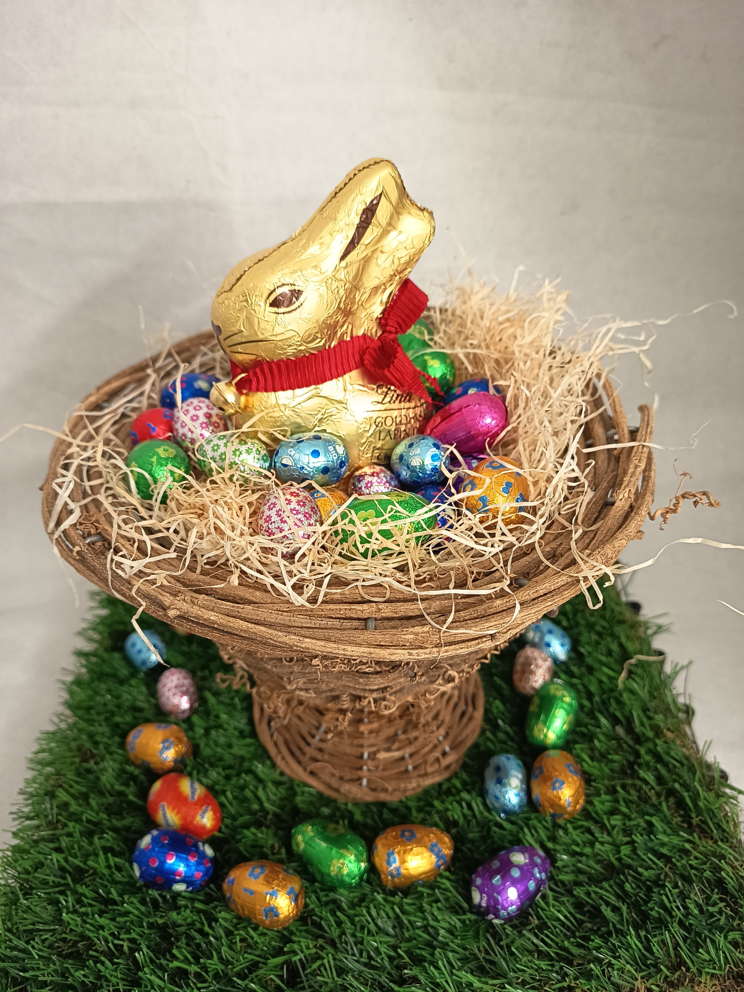 A medium shot shows a chocolate Easter bunny sitting in a wicker basket filled with shredded raffia and wrapped chocolate eggs. The chocolate bunny is gold and wears a red ribbon around its neck. The…read more
