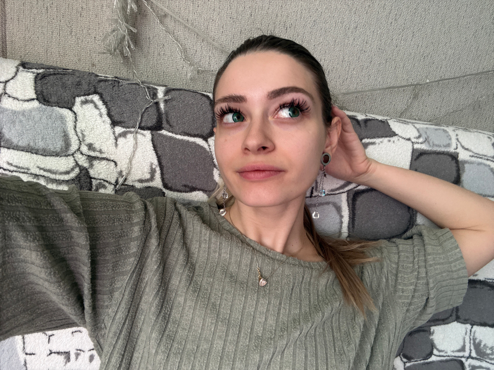 A young woman is lying on her back on a grey and white patterned blanket. She is wearing a green ribbed shirt and has long brown hair. She is wearing earrings and a necklace. The location is unspecifi…read more